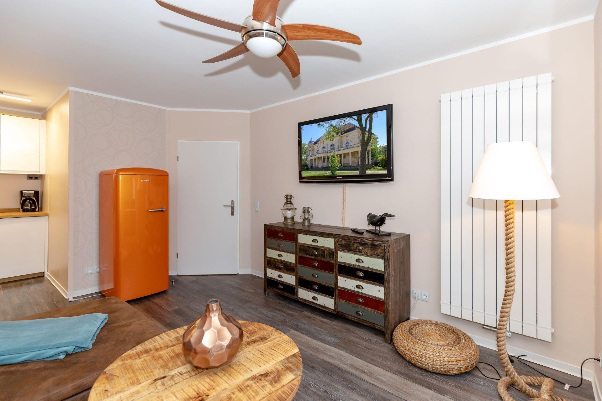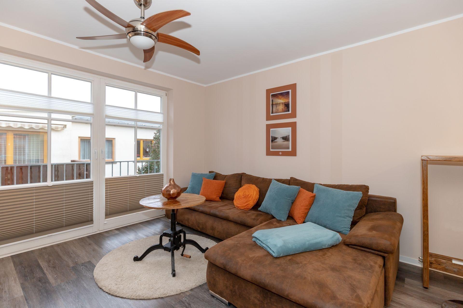 Der offene Wohnbereich ist mit einem bequemen Sofa, moderner Deko und einem Deckenventilator ausgestattet. Hier finden Sie Erholung nach einem ereignisreichen Urlaubstag.