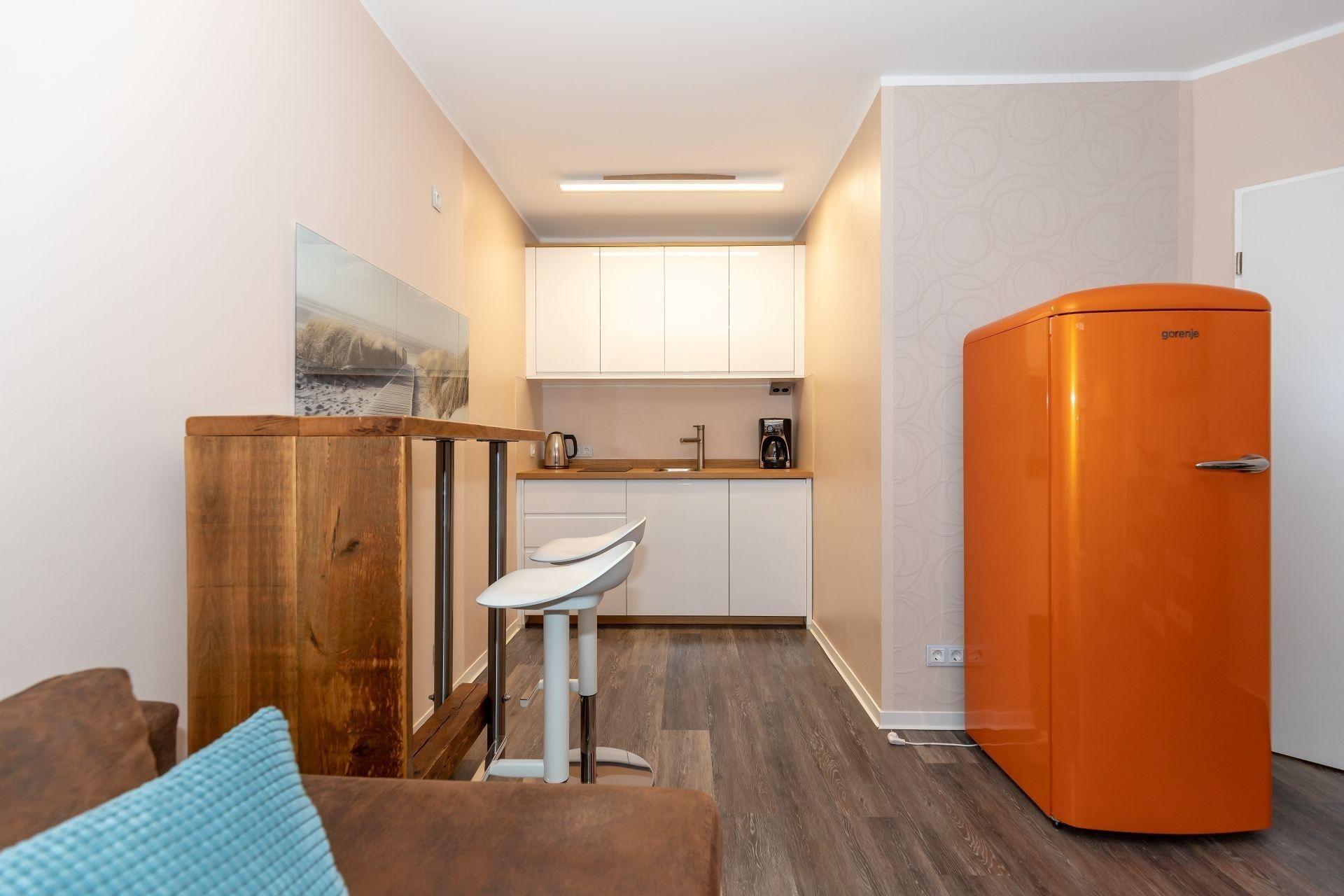 Der Küchenbereich grenzt direkt an den Wohnbereich, sodass auch der Koch oder die Köchin nicht vom Geschehen abgeschnitten sind. Die Küche ist voll ausgestattet, schnell und bequem können Sie Ihre Lieblingsmahlzeit zaubern.