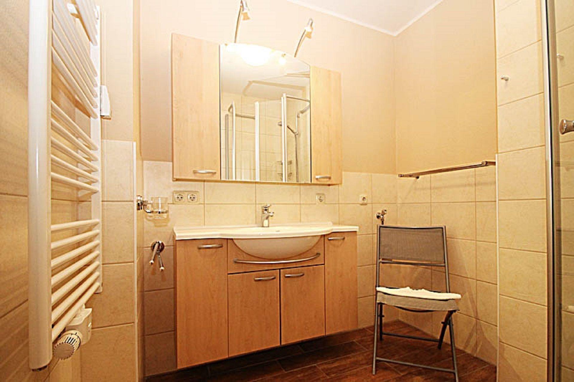 Das Badezimmer ist mit einer Dusche sowie einem Waschbecken mit Unterschrank ausgestattet. Das WC befindet sich separat in einem Raum mit einem weiteren Waschbecken.