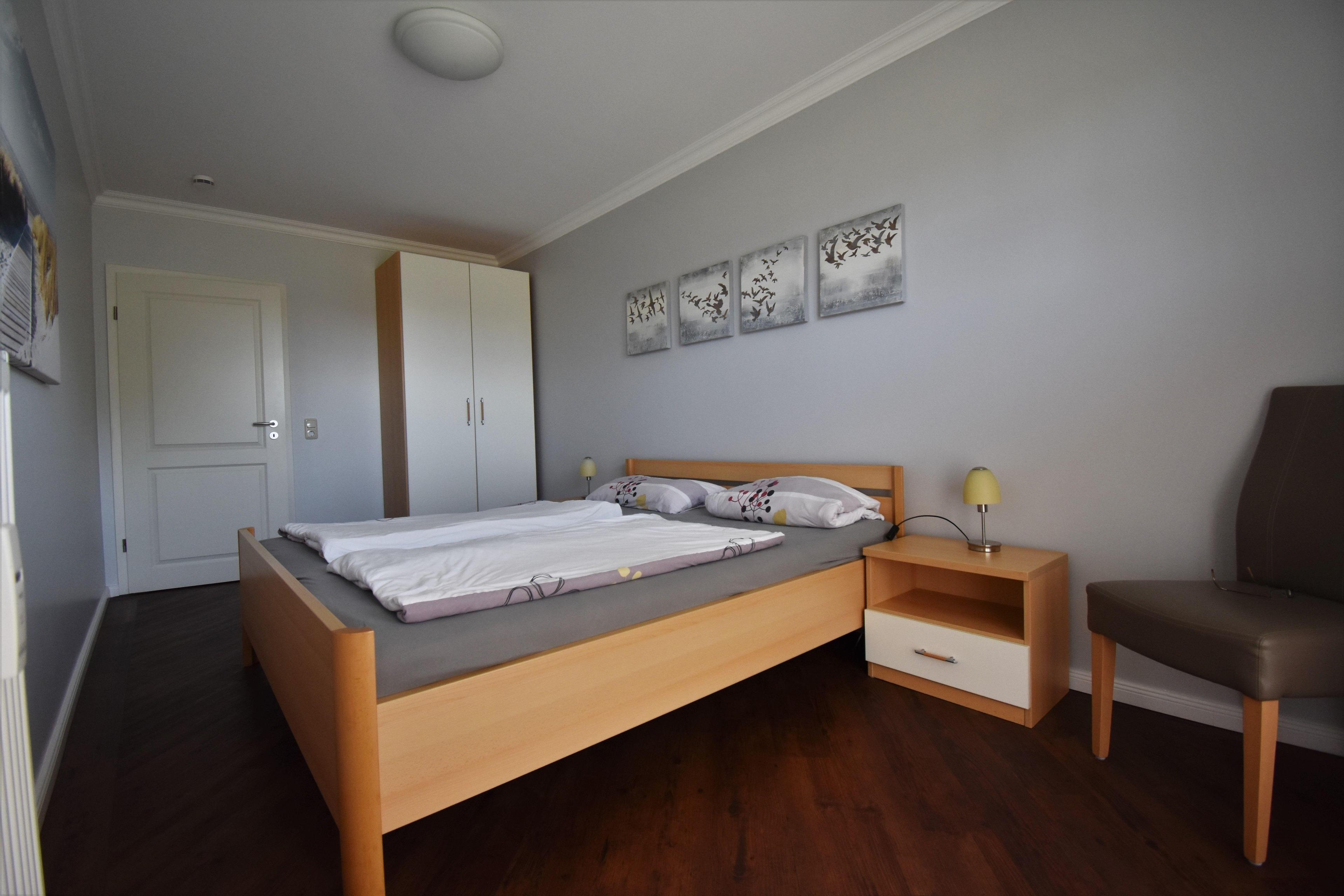 Das erste Schlafzimmer verfügt über ein Doppelbett, einen 2-türigen Kleiderschrank sowie 2 Nachtschränke.