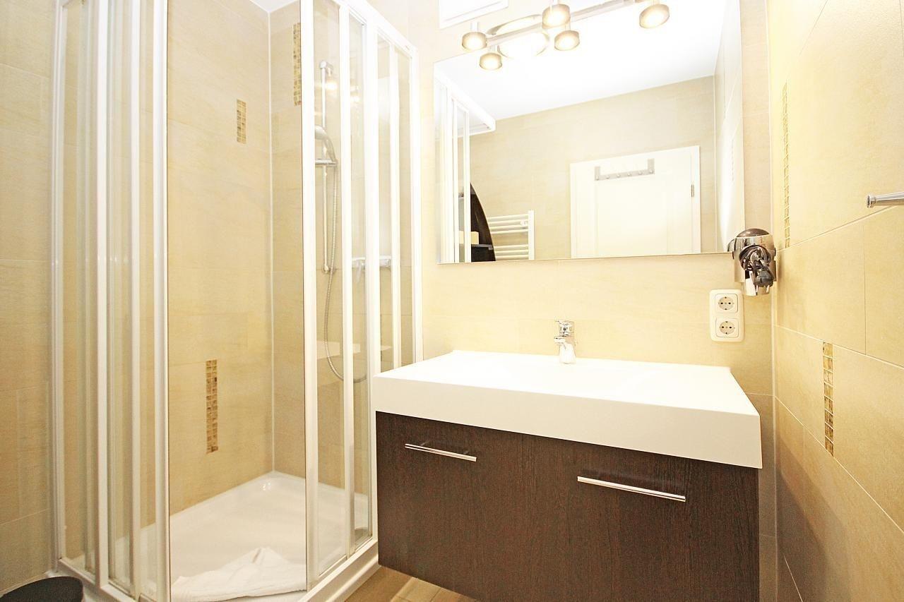 Das hochwertig ausgestattete Badezimmer verfügt über eine Fußbodenheizung, eine Dusche sowie einen großzügigen Waschtisch mit Unterschrank. Ein großer beleuchteter Spiegel, ein Haartrockner sowie ein Handtuchheizkörper sind ebenfalls vorhanden.