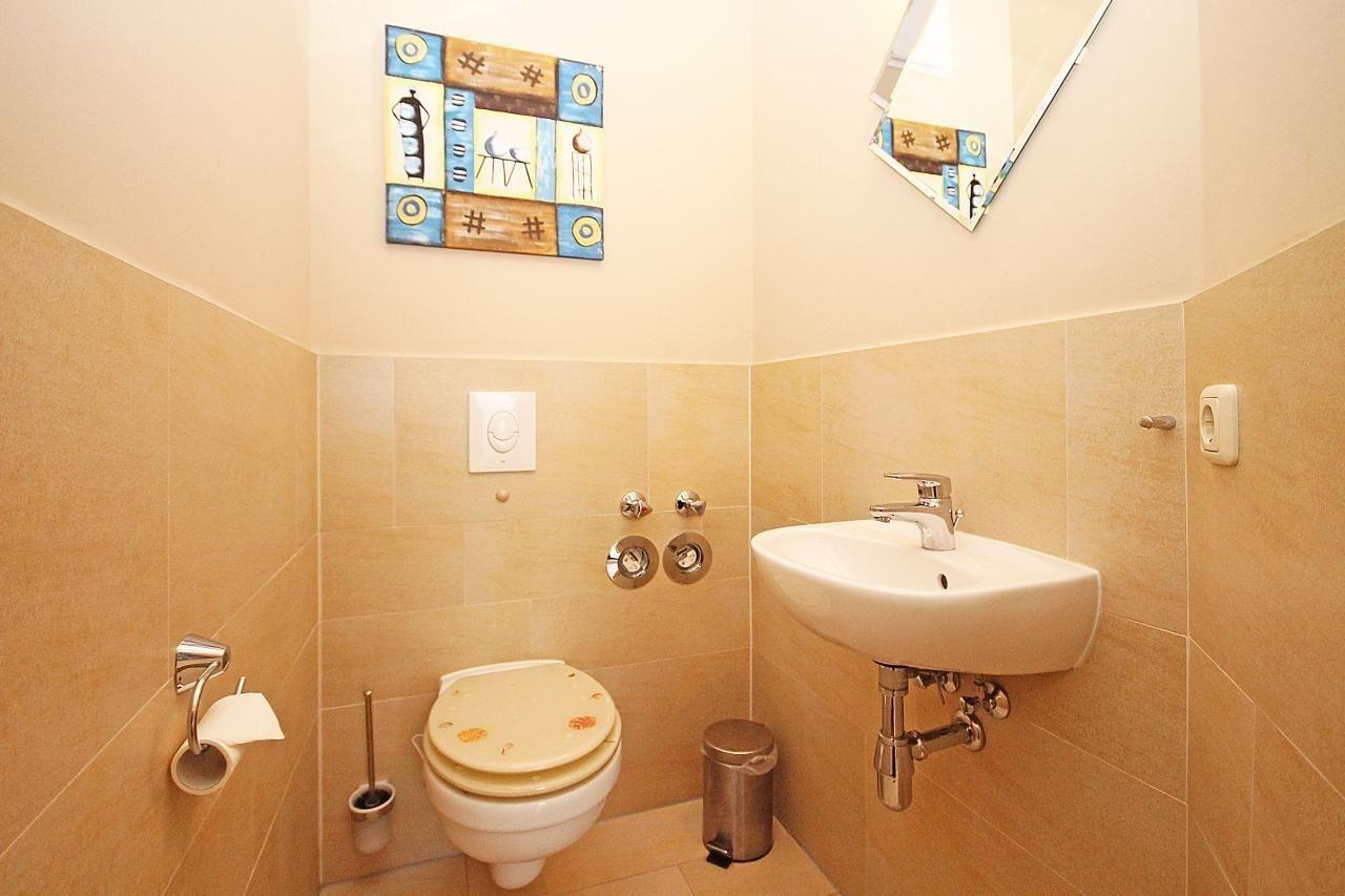 Das WC mit einem weiteren Waschbecken befindet sich in einem separaten Raum.