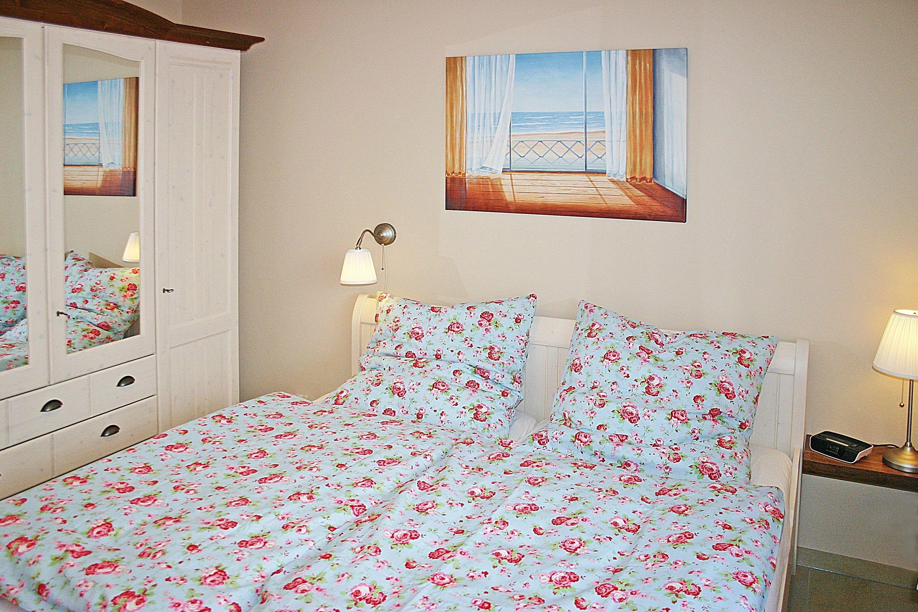 Das Schlafzimmer ist mit einem bequemen Doppelbett mit getrennten Matratzen und einem großen geräumigen Kleiderschrank ausgestattet.
