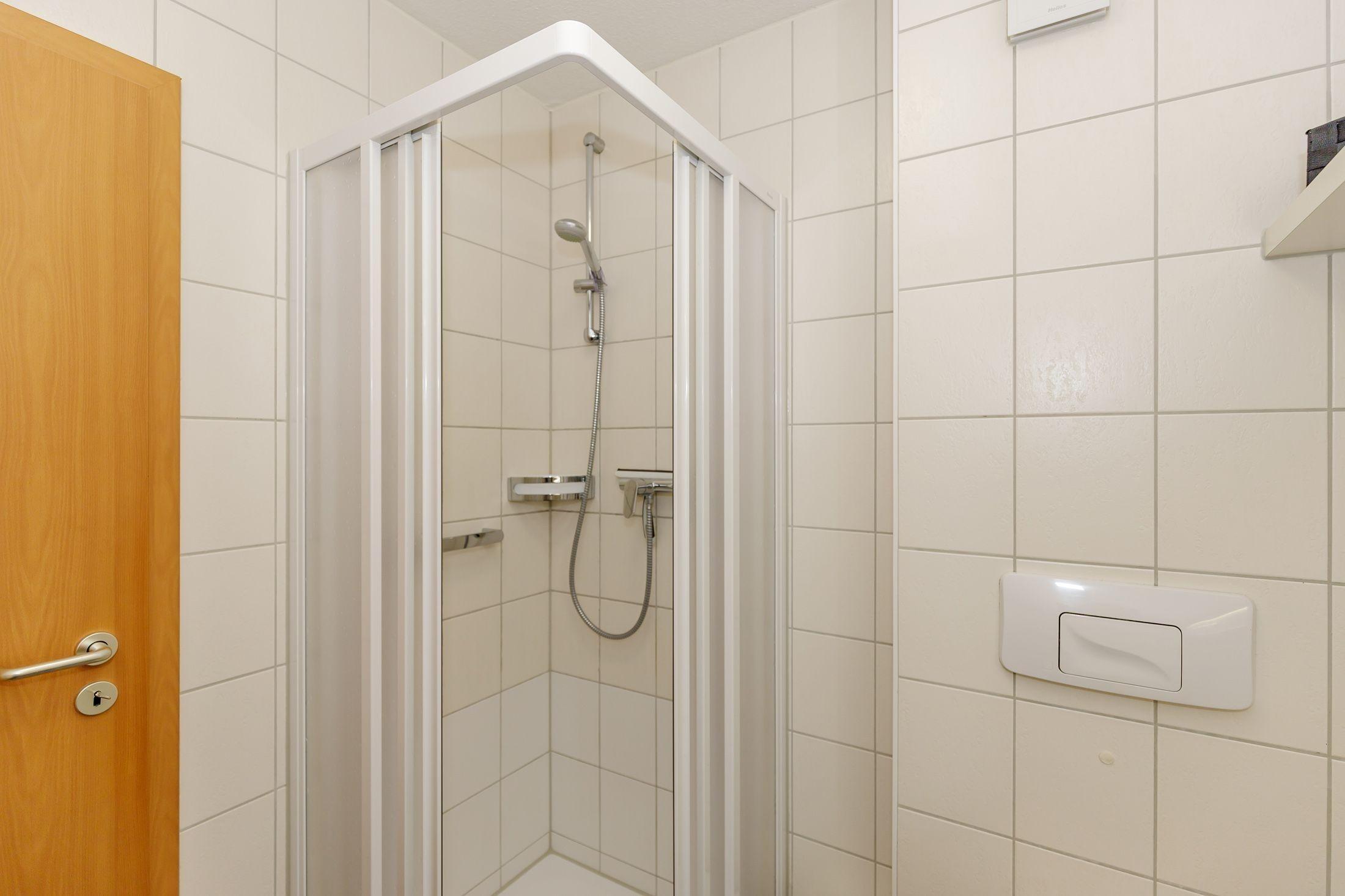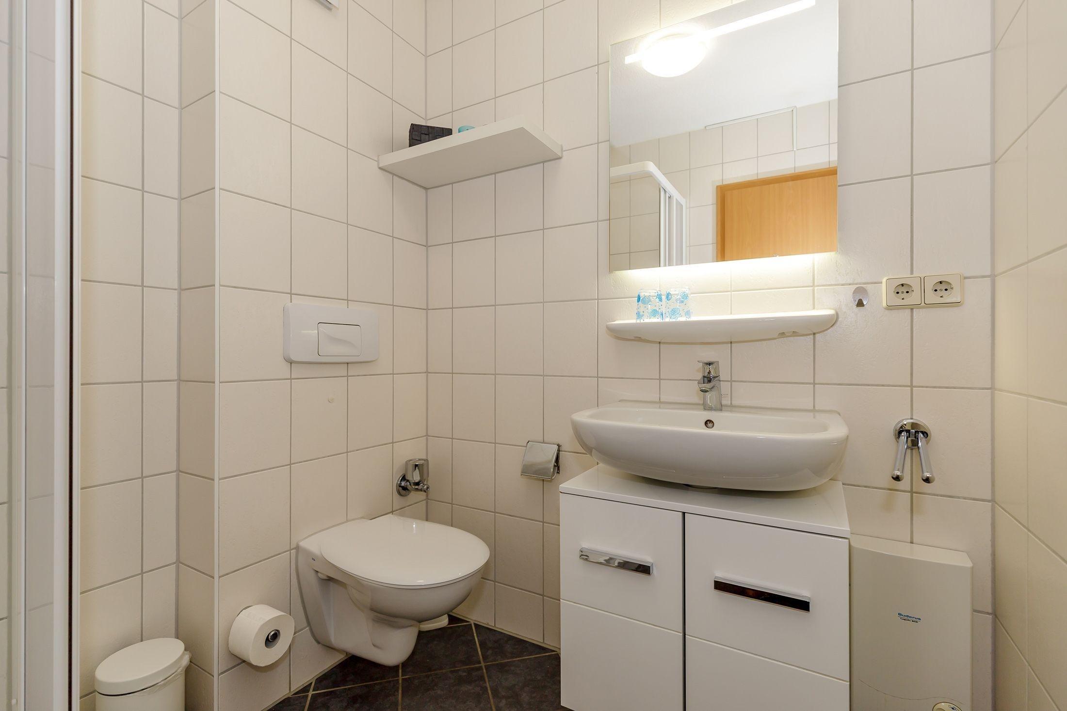 Das Badezimmer ist mit einer Dusche, einem WC, einem Spiegelschrank und einem Aufsatzwaschbecken mit Unterschrank ausgestattet. Es gibt also ausreichend Ablagemöglichkeiten für Ihre Badutensilien.