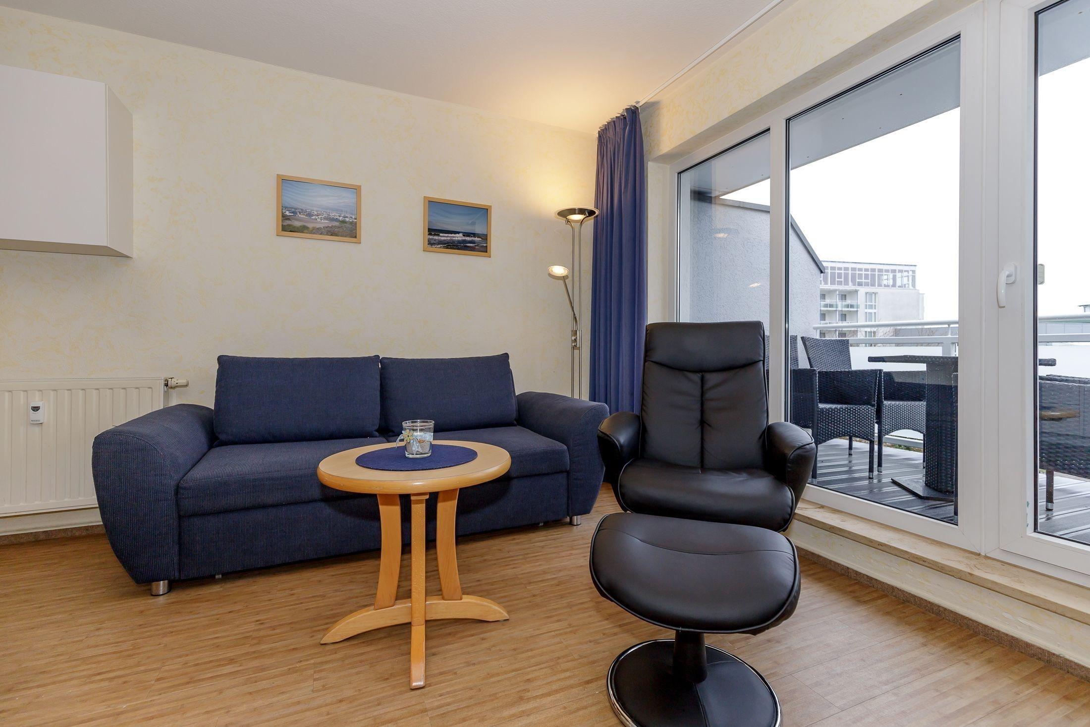 Der gemütliche Wohnbereich ist mit einer Sofa- und Sesselecke eingerichtet. Das Sofa ist mit wenigen Handgriffen zu einem Schlafplatz für 2 Personen umfunktioniert. Genießen Sie hier gemeinsam erholsame Stunden, für die Unterhaltung am Abend steht Ihnen ein Flachbildschirm-Gerät zur Verfügung.