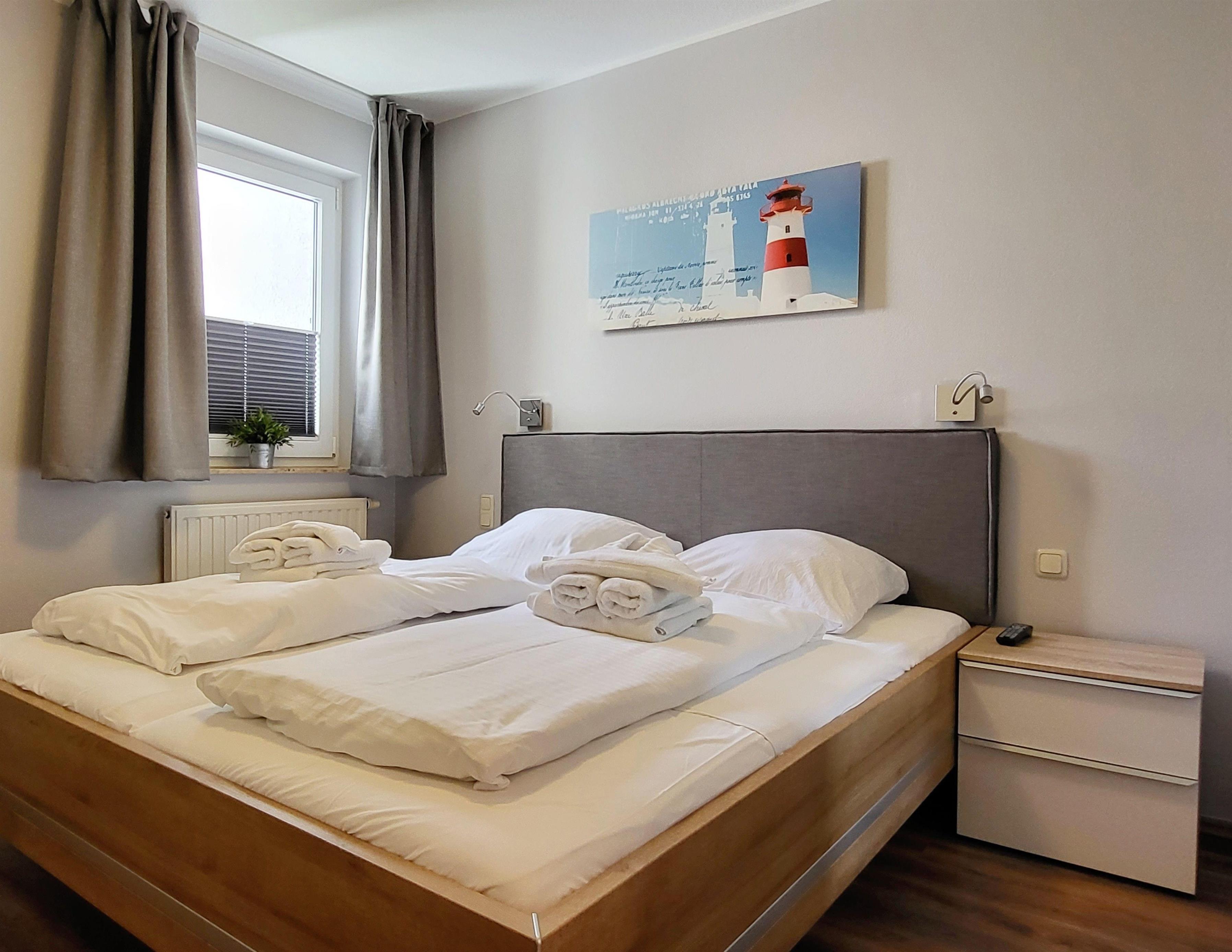 Das separate Schlafzimmer ist mit einem bequemen Doppelbett eingerichtet. Ein erholsamer Schlaf ist garantiert. Für Ihre Urlaubsgarderobe steht ein geräumiger Kleiderschrank bereit.