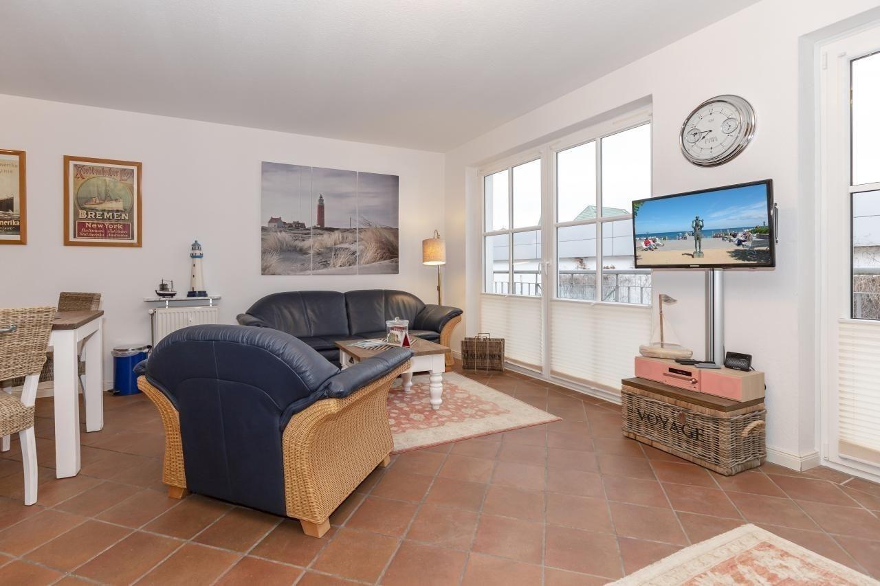 Im Wohnbereich befindet sich eine gemütliche Couch mit einem bequemen Sessel, hier können Sie entspannt bei einem leckeren Getränk gemeinsam einen ereignisreichen Tag gemütlich ausklingen lassen.