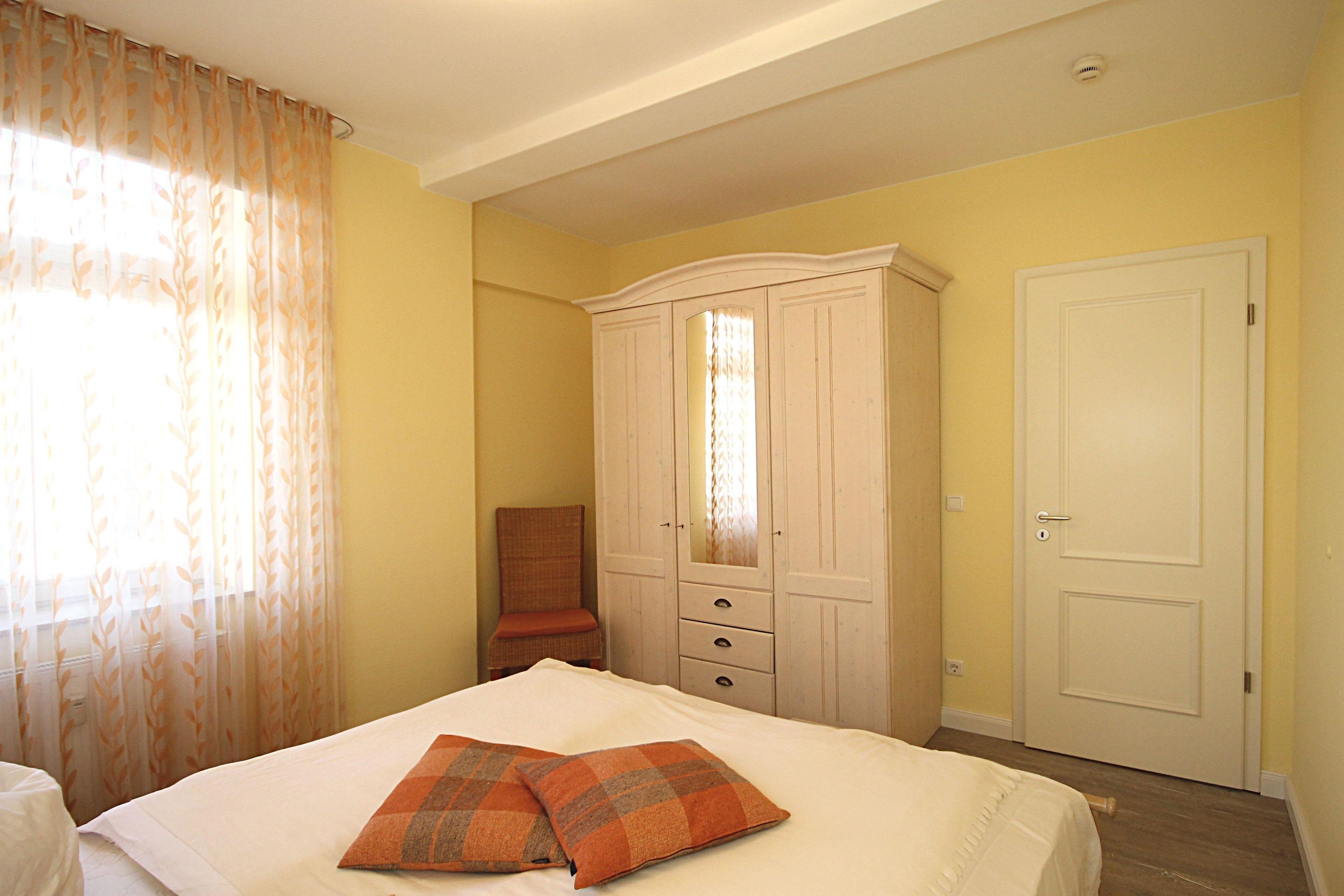 Das Schlafzimmer ist mit einem bequemen Doppelbett und geräumigem Kleiderschrank für Ihre Urlaubsgarderobe ausgestattet.