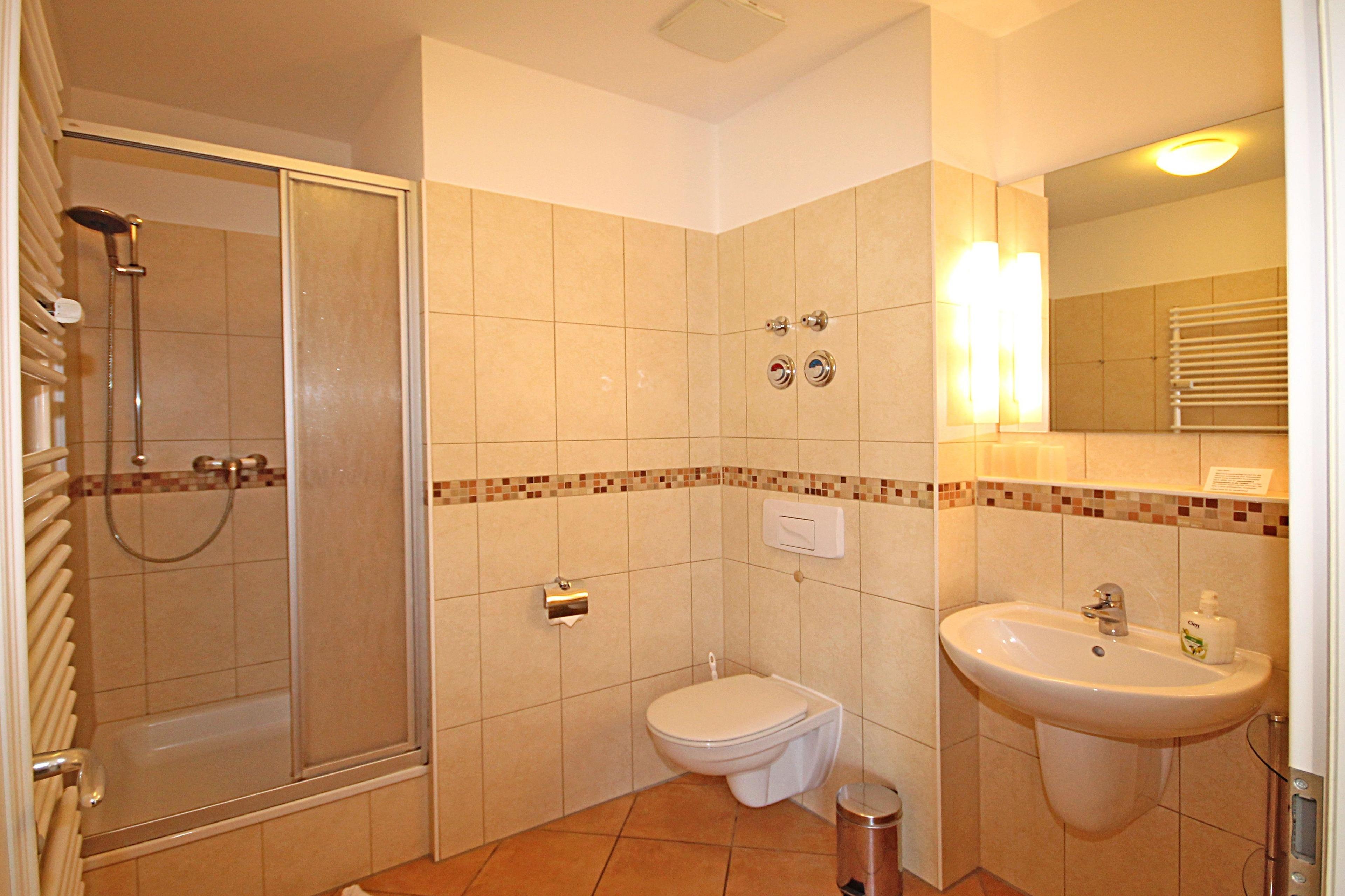 Das Badezimmer verfügt über eine Dusche, ein WC sowie über ein Waschbecken mit Spiegel.