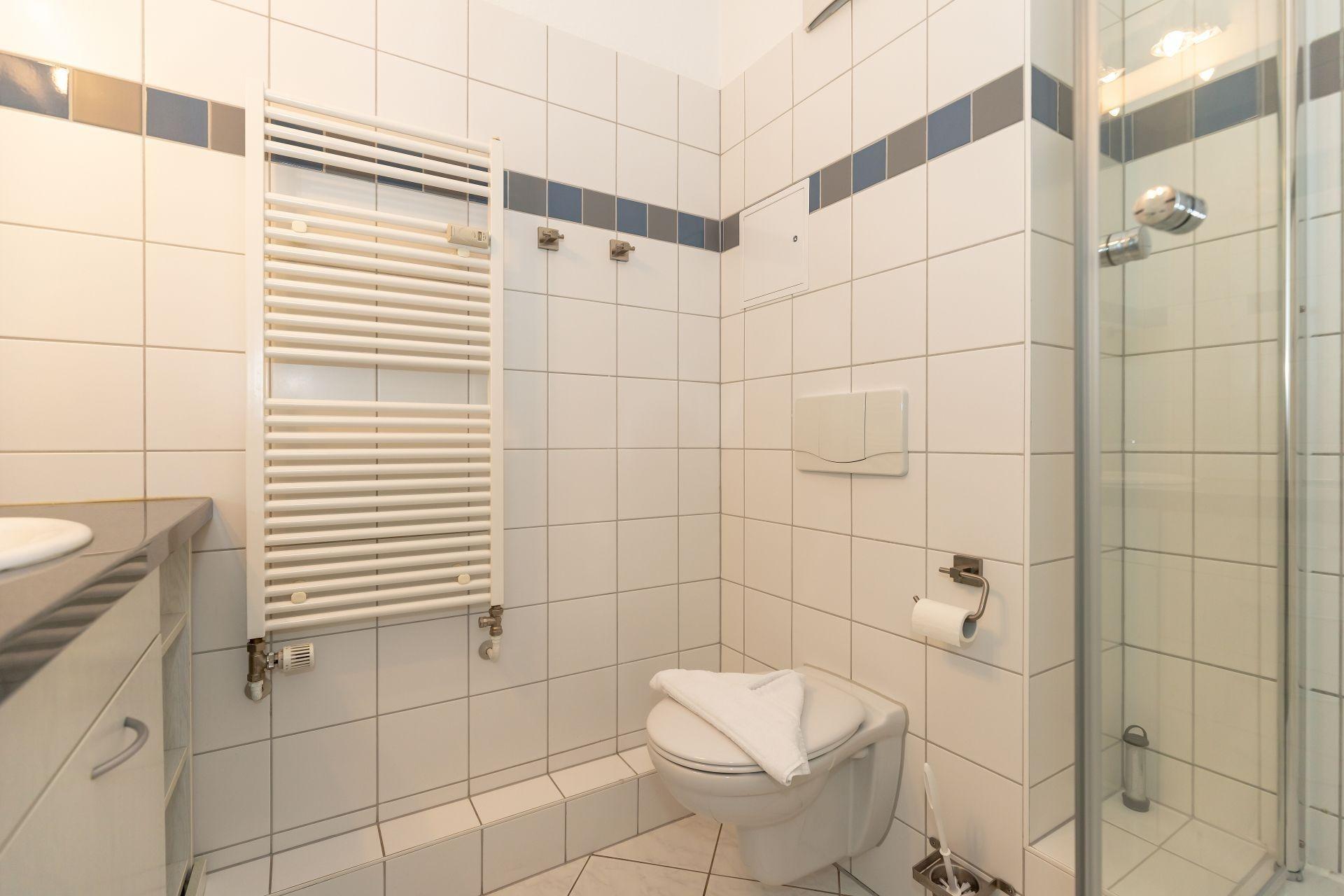 Das Badezimmer verfügt über eine Dusche, ein WC, einen Handtuchheizkörper und einen Waschtisch mit Unterschrank. Ihre Badutensilien finden ausreichend Platz auf den vorhandenen Ablageflächen.