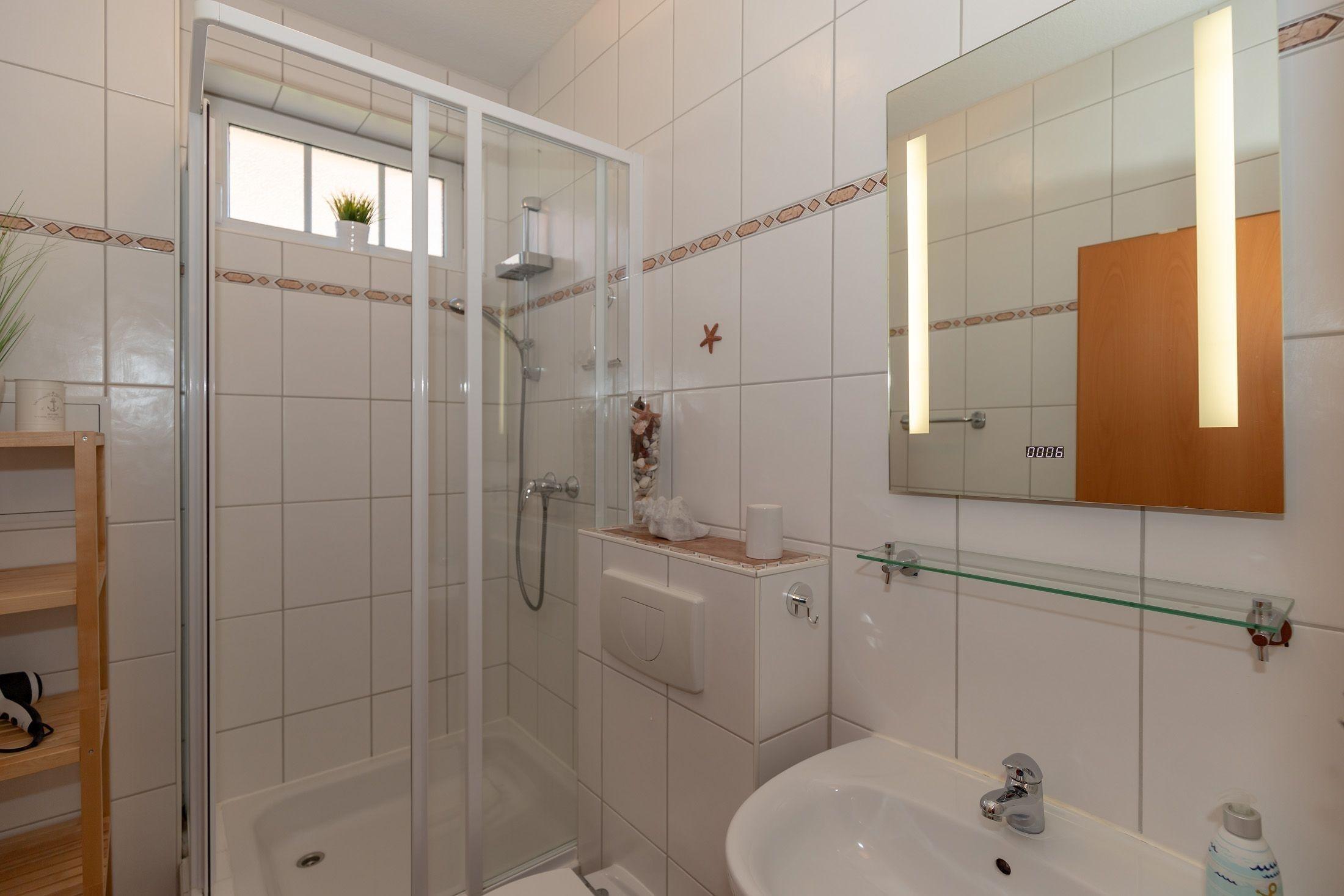 Das Badezimmer mit Tageslicht verfügt über eine Dusche, ein Waschbecken, ein WC und einen Handtuchheizkörper. Für Ihre Badutensilien stehen Ihnen ausreichend Ablagemöglichkeiten zur Verfügung. Ein Föhn ist ebenfalls vorhanden.