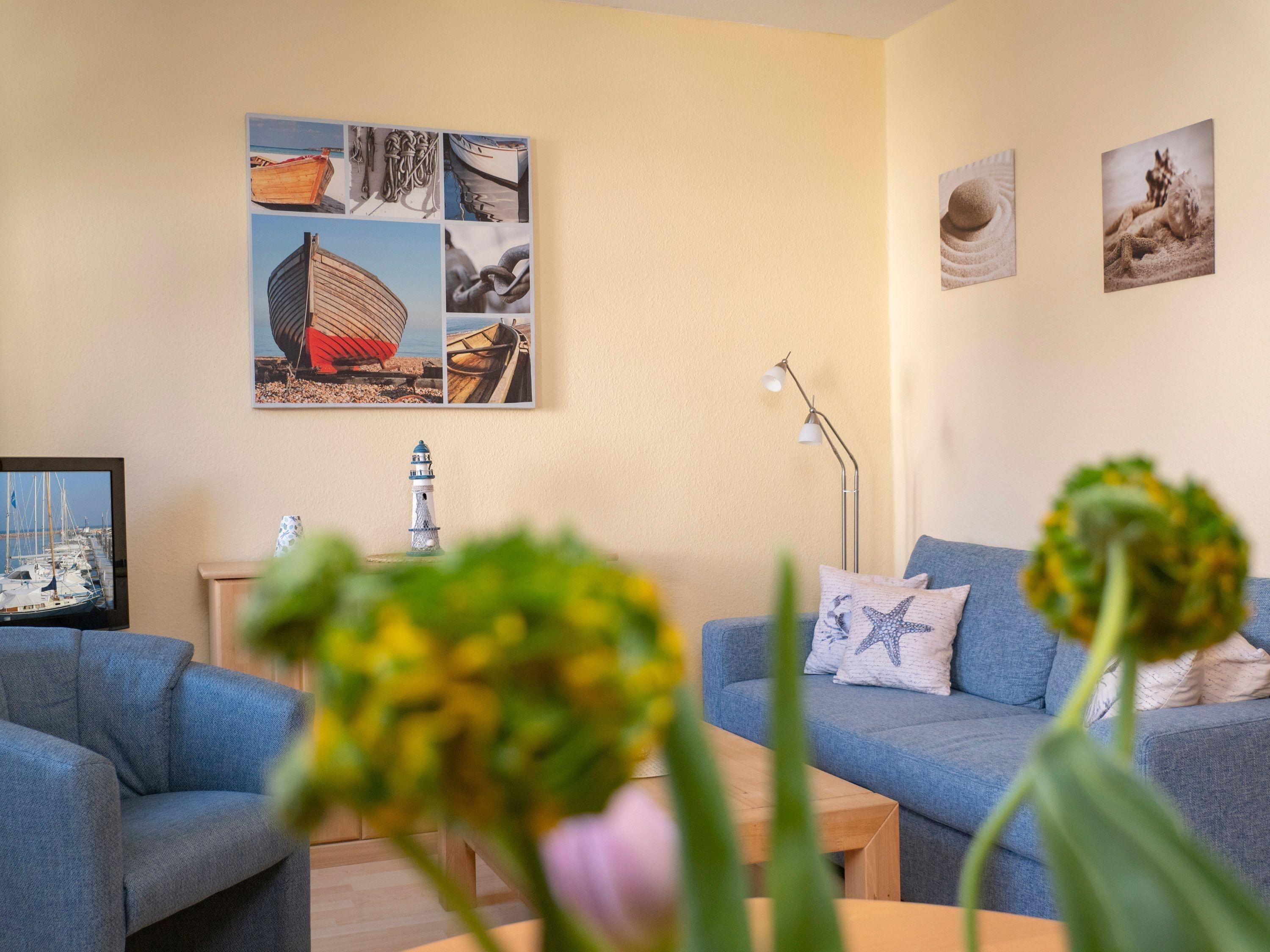 Im Wohnzimmer mit Doppelschlafcouch erwarten Sie eine Flachbild-TV mit Bluray-Player sowie abwechslungsreiche Bücher und Spiele für Kinder und Erwachsene.
