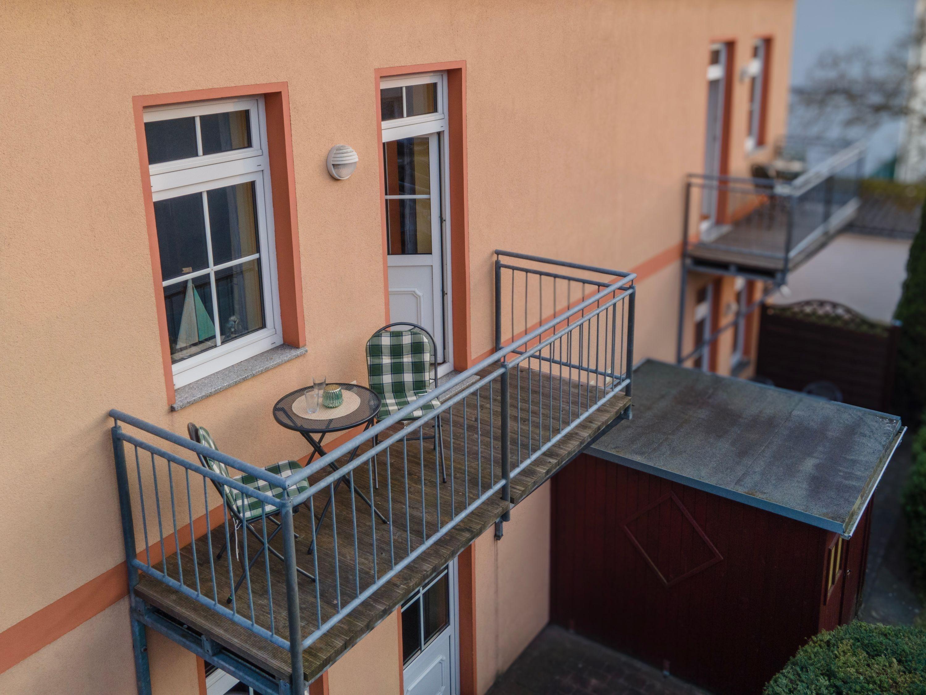 Bequeme Gartenmöbel laden auf dem einladenden Balkon zum Relaxen ein.