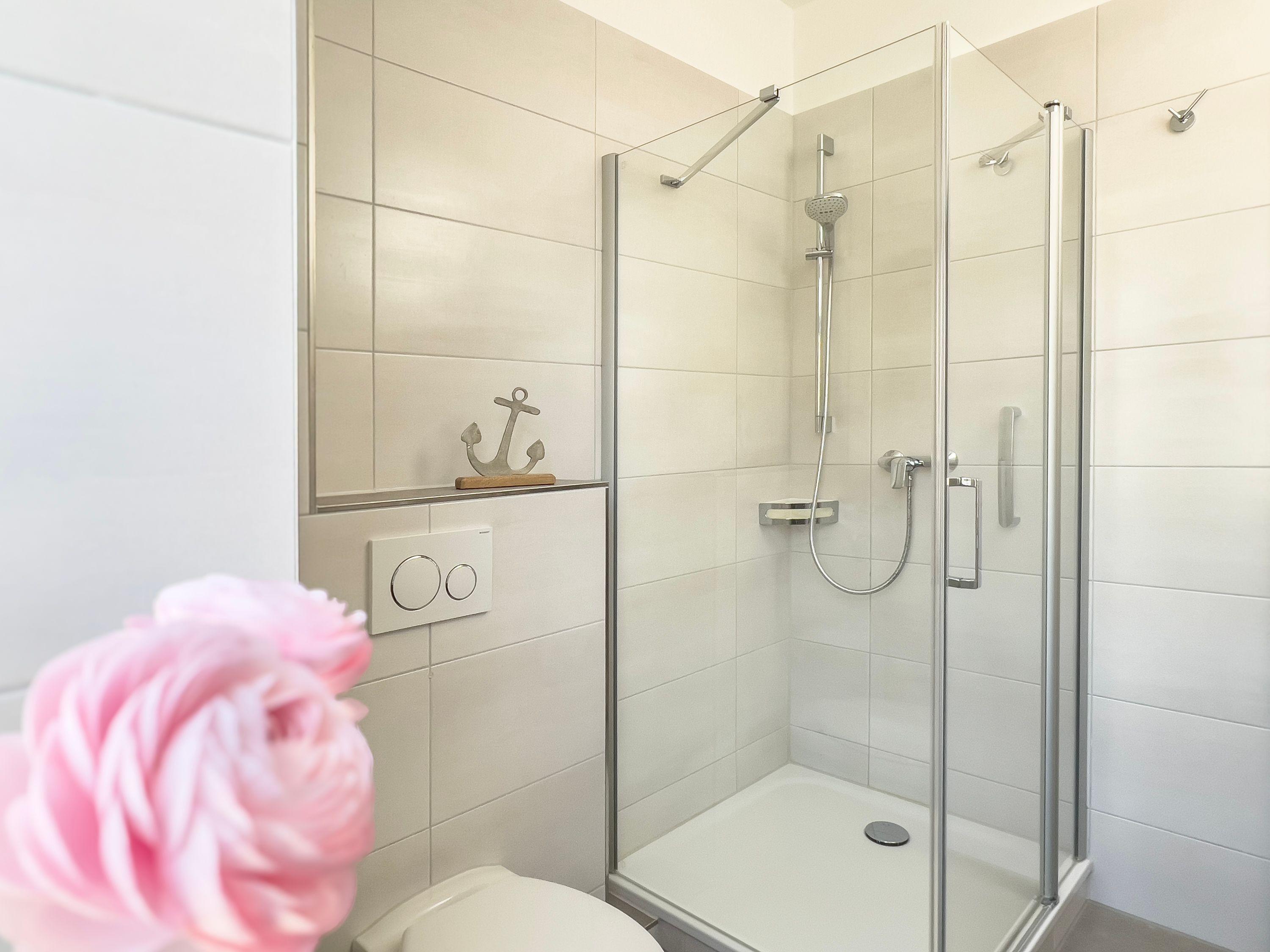 Das moderne Badezimmer mit Fenster verfügt über eine Dusche, ein WC, ein Waschbecken mit Unterschrank sowie einen Handtuchheizkörper. Hier finden Sie auch genügend Abstellfläche für Kosmetika und weitere Badutensilien.