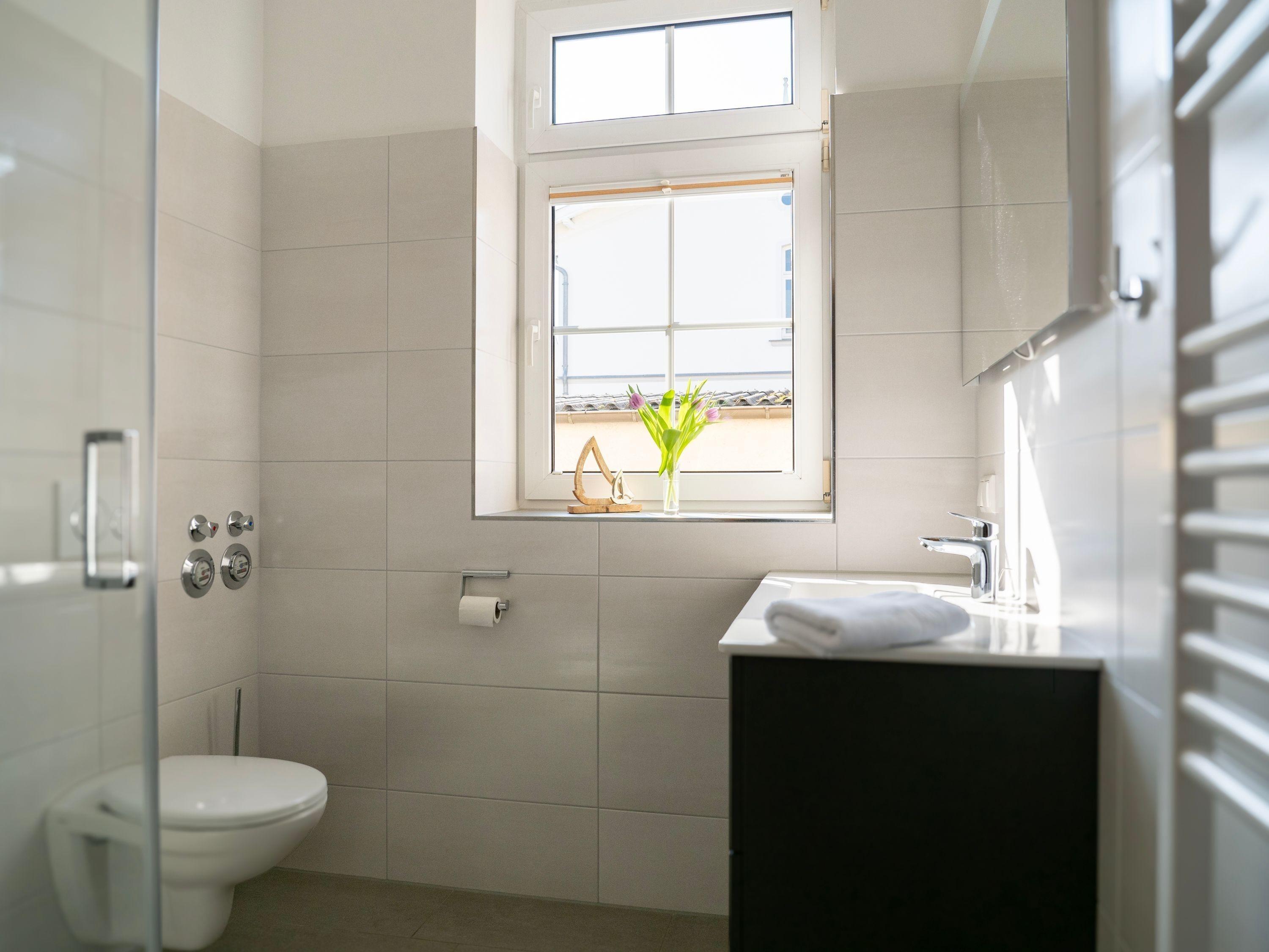 Das moderne Badezimmer mit Fenster verfügt über eine Dusche, ein WC, ein Waschbecken mit Unterschrank sowie einen Handtuchheizkörper. Ihre Badutensilien finden Platz auf ausreichend vorhandenen Abstellflächen.