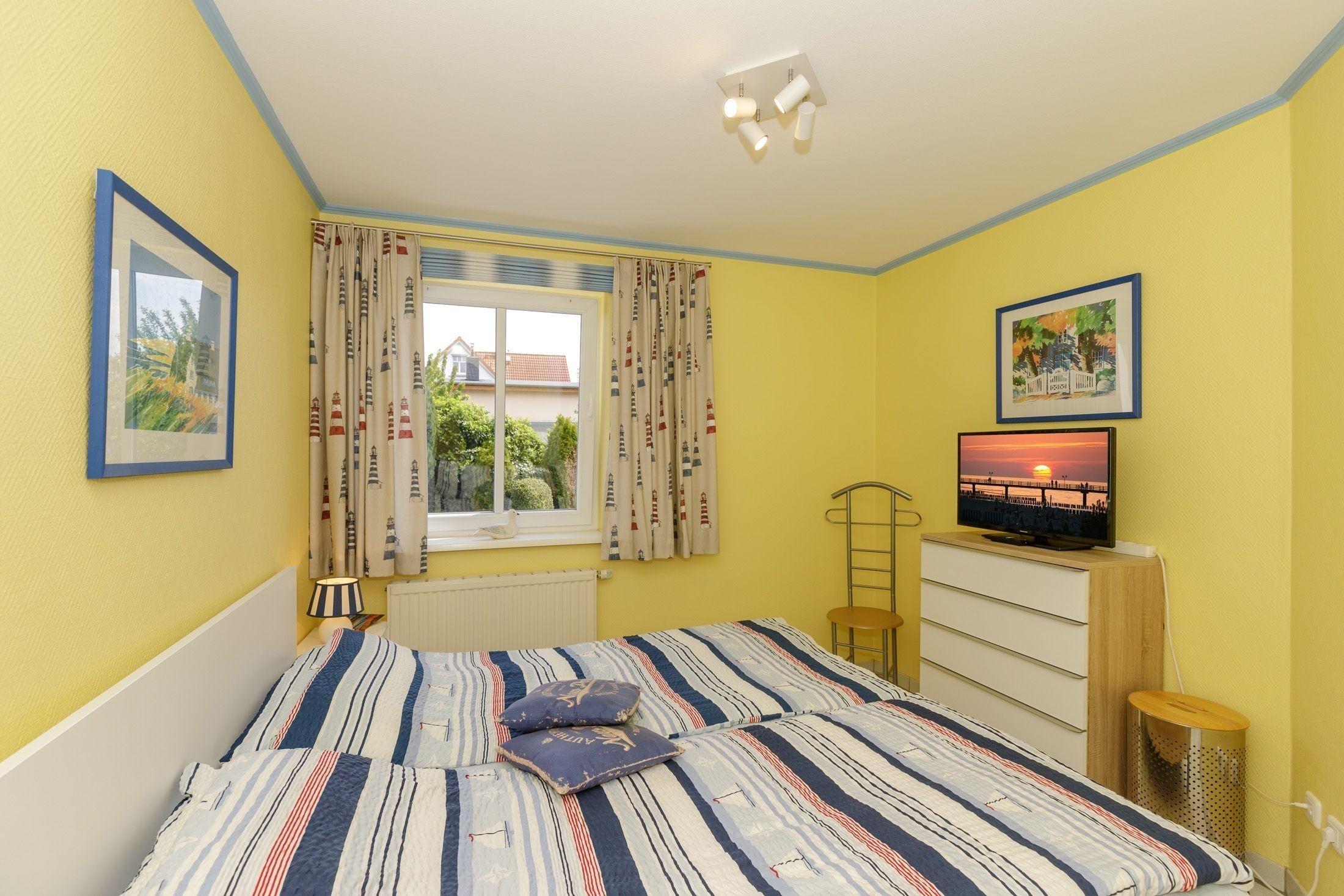 Das Schlafzimmer ist mit einem Doppelbett (180 m x 200 m) mit höhenverstellbarem Lattenrost und Einzelmatratzen, Nachttischen, Leselampe und einem zweiten Kabel-TV ausgestattet. Ein 5-türiger Kleiderschrank bietet viel Platz für die gesamte Urlaubsgarderobe.