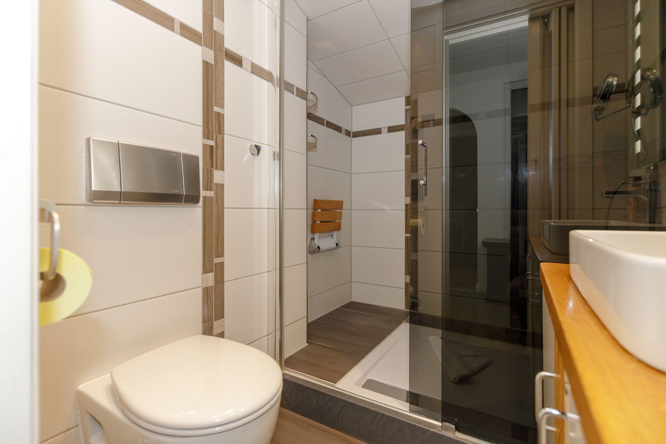 Geht man durch die Tür neben der Bar, gelangt man in ein eigenes kleines Reich, über das sich auch die Kleinen freuen werden. Dort befinden sich das dritte Schlafzimmer mit Doppelbett, Flatscreen und ein weiteres modernes Gäste-WC mit Duschbereich inkl. ausklappbarem Duschsitz.