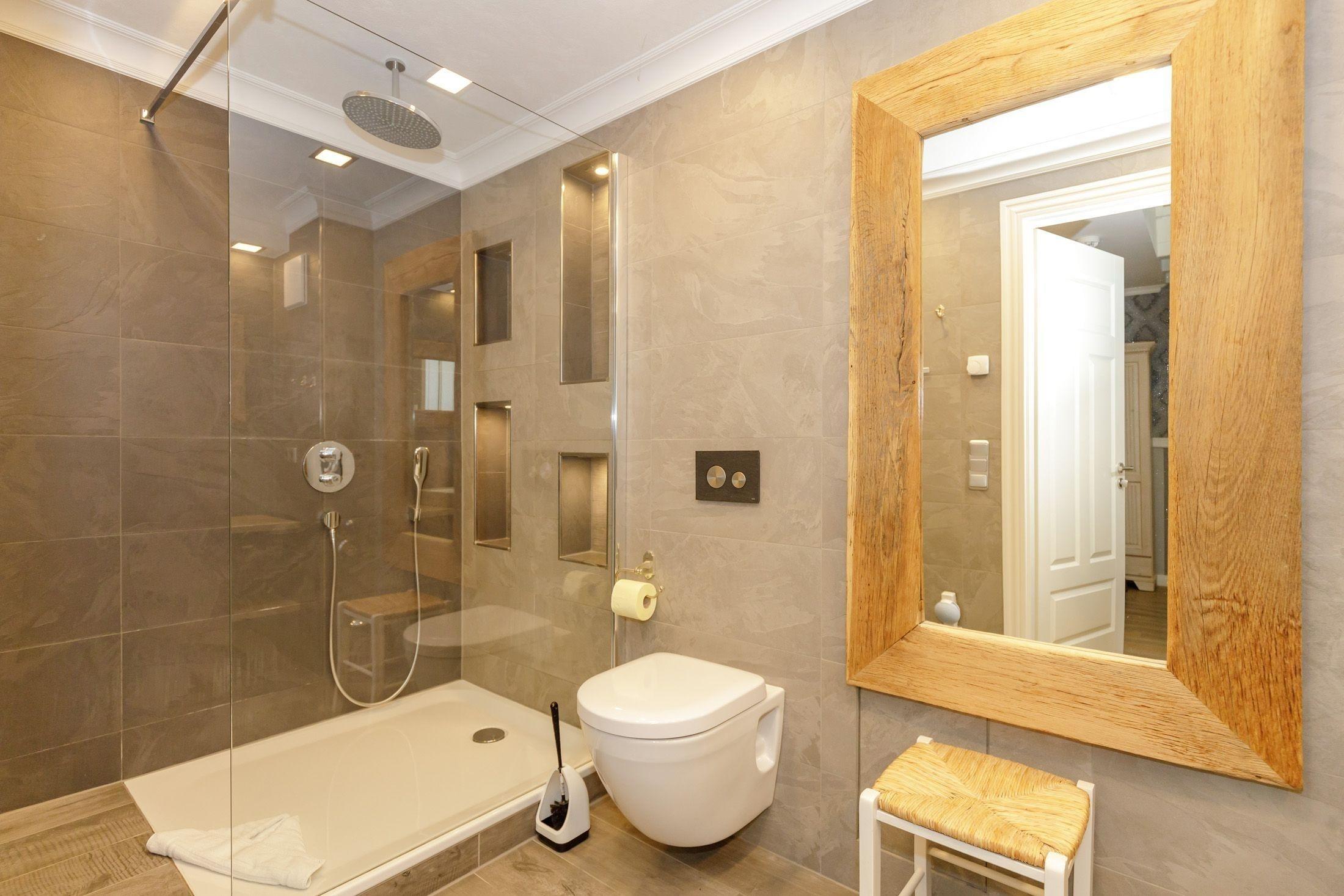 Das im März 2018 komplett erneuerte moderne Hauptbad im Erdgeschoss verfügt über eine ebenerdige Wellnessdusche, für den längeren Aufenthalt steht Ihnen in der Küche eine Waschmaschine und ein Trockner kostenfrei zur Verfügung!
