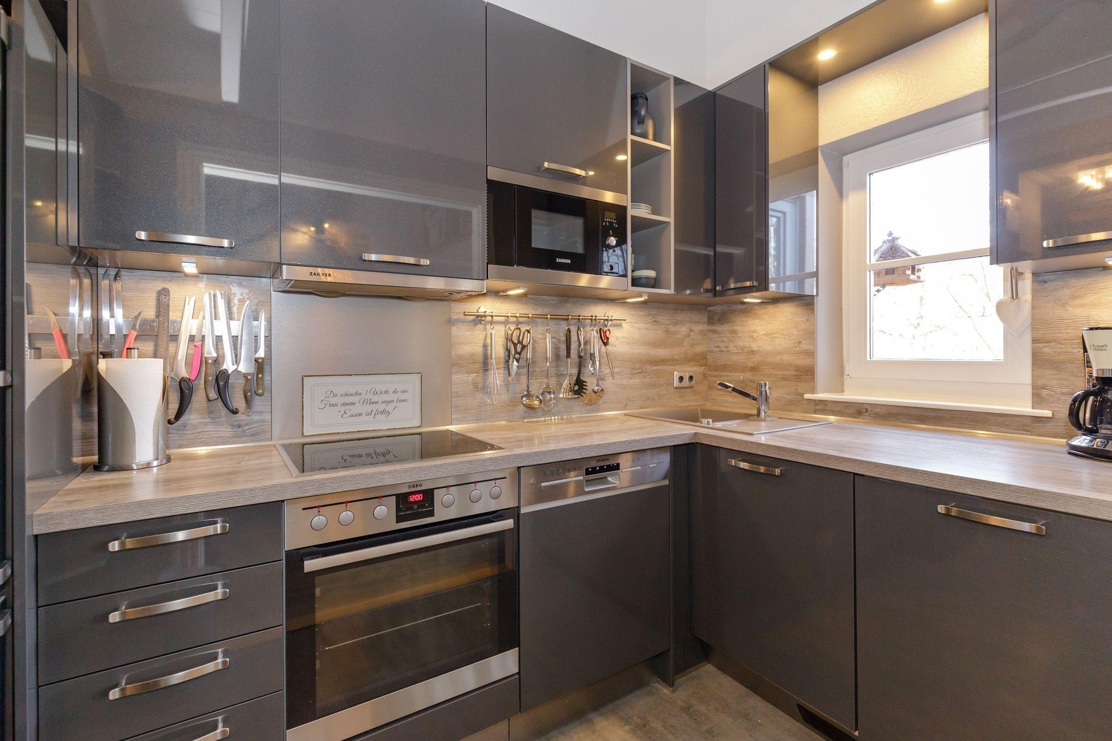 Die moderne und voll ausgestattete separate Küche verfügt nebst Backofen mit 4-Platten-Cerankochfeld außerdem über Mikrowelle, Toaster, Wasserkocher, Kaffeemaschine, Geschirrspüler, Kühlschrank mit Gefrierfach und natürlich genügend Geschirr und Besteck. An die Küche schließt sich ein kleiner Abstellraum an. Die Küche wurde im März 2018 erneuert.