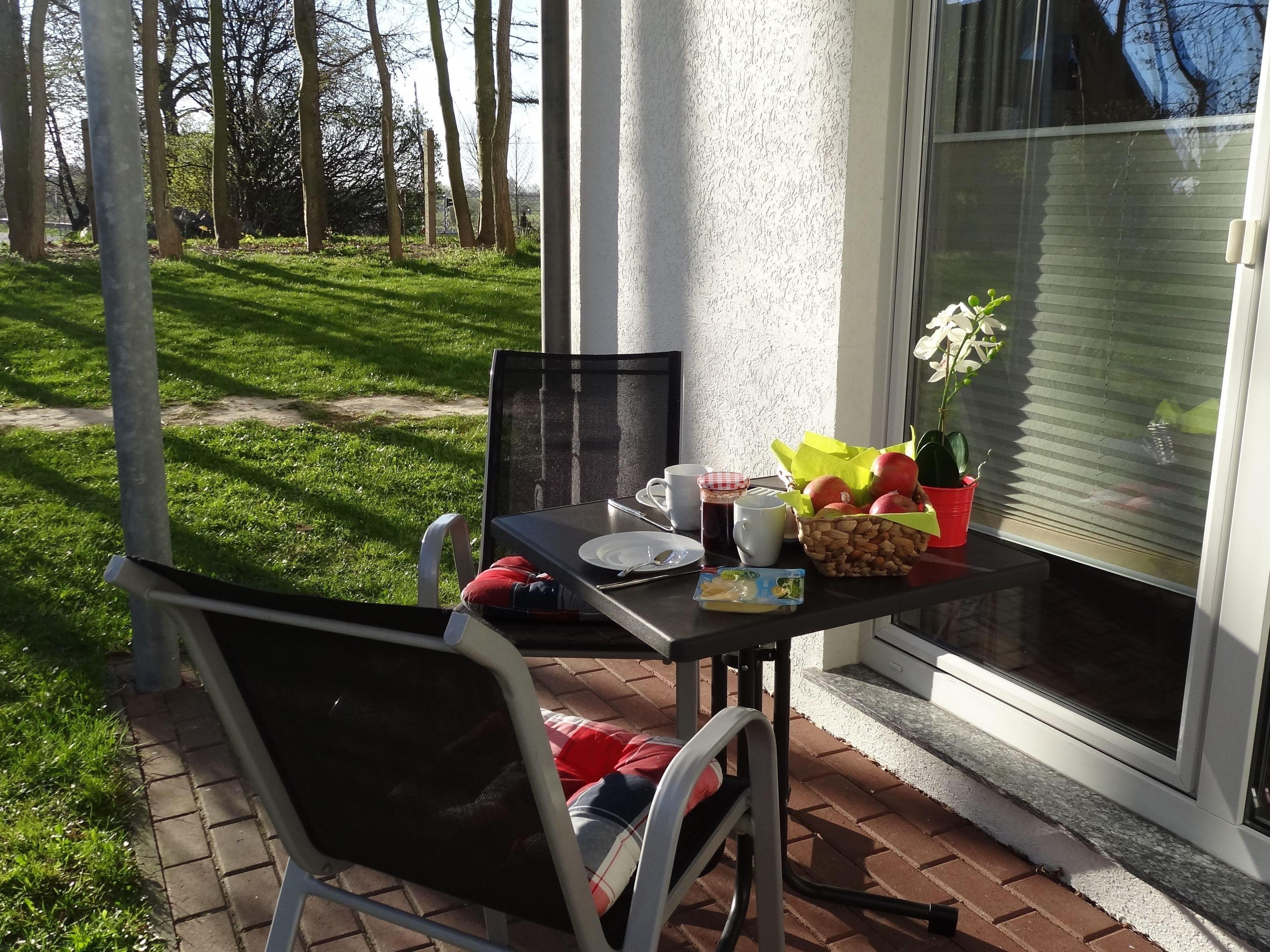 An Ihre Wohnung grenzt eine Terrasse zur Nordseite, die Sie direkt von Ihrem Wohnbereich aus betreten können. Sie ist mit einem Tisch, einer Gartenbank, 2 Stühlen und einem Wäscheständer ausgestattet. Einem gemütlichen Zusammensitzen steht hier nichts im Wege.