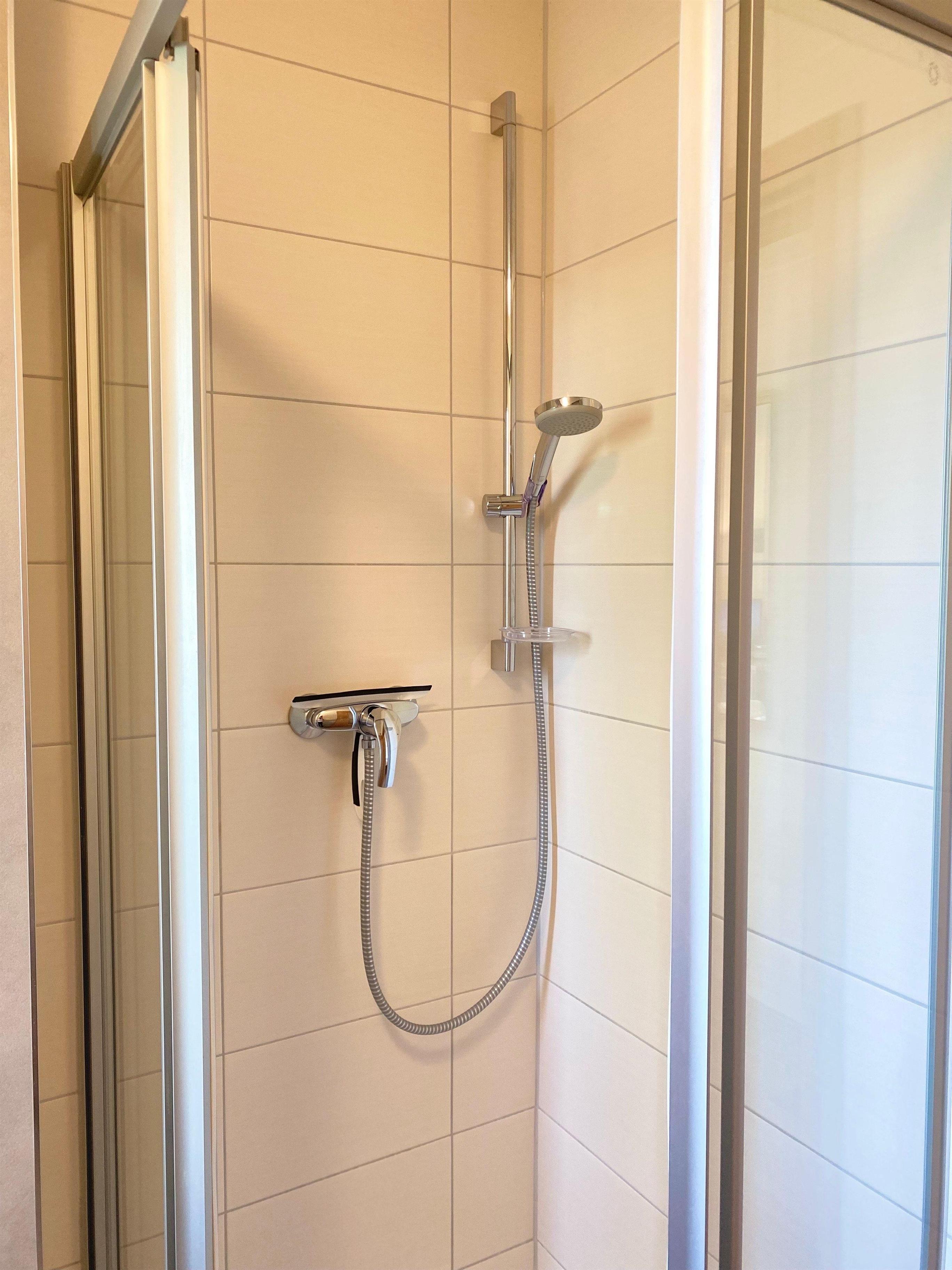 Das Badezimmer ist modern eingerichtet mit WC, einem Handtuch-Heizkörper, einem Waschbecken sowie einer Echtglasdusche mit niedrigem Einstieg.