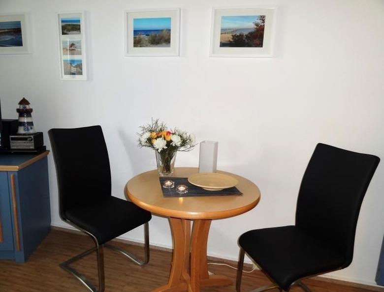 Der komfortable Wohnbereich ist mit zwei Cocktailsesseln, einem 32 Zoll-LED-Flach-TV und einer HiFi-Anlage mit USB Anschluss eingerichtet. Der Essbereich ist mit zwei Lederstühlen ausgestatttet.