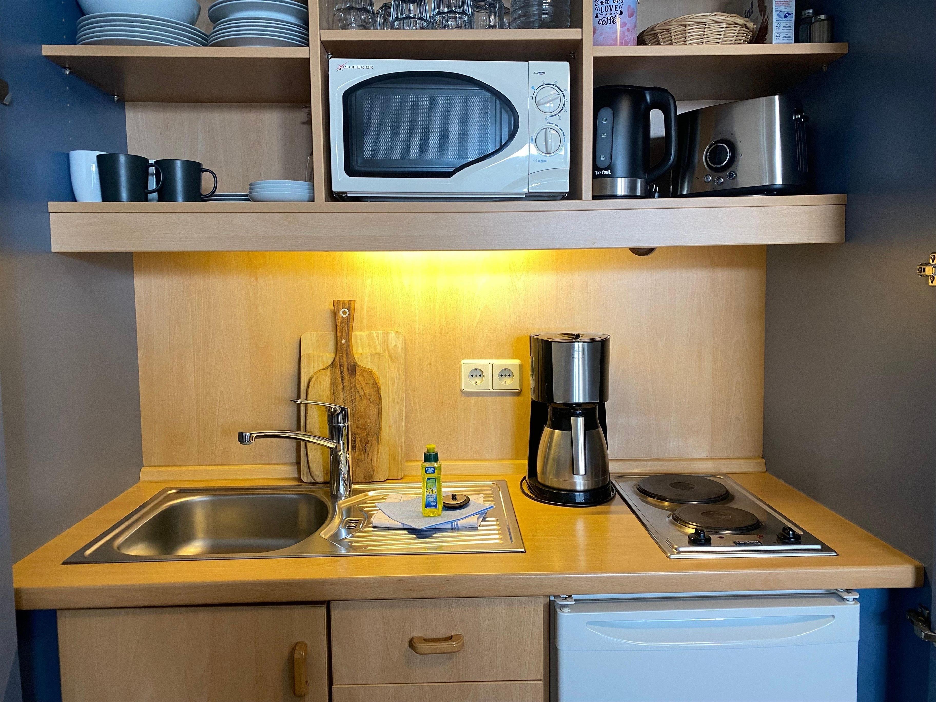 An den Wohn-Schlafbereich grenzt eine Pantryküche, die voll ausgestattet ist. Hier finden Sie einen 4-Sterne-Kühlschrank mit Gefrierfach, 2-Platten-Herd, Toaster, Thermokaffeemaschine, Wasserkocher, Eierkocher, Mikrowelle und natürlich genügend Geschirr.