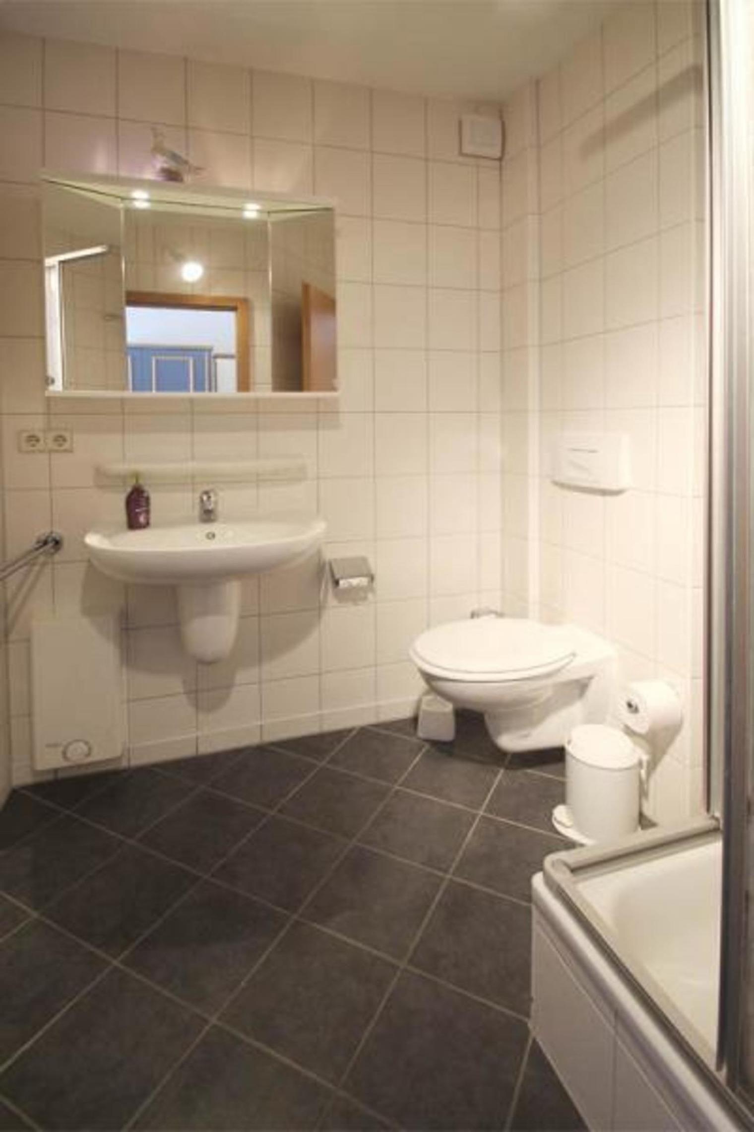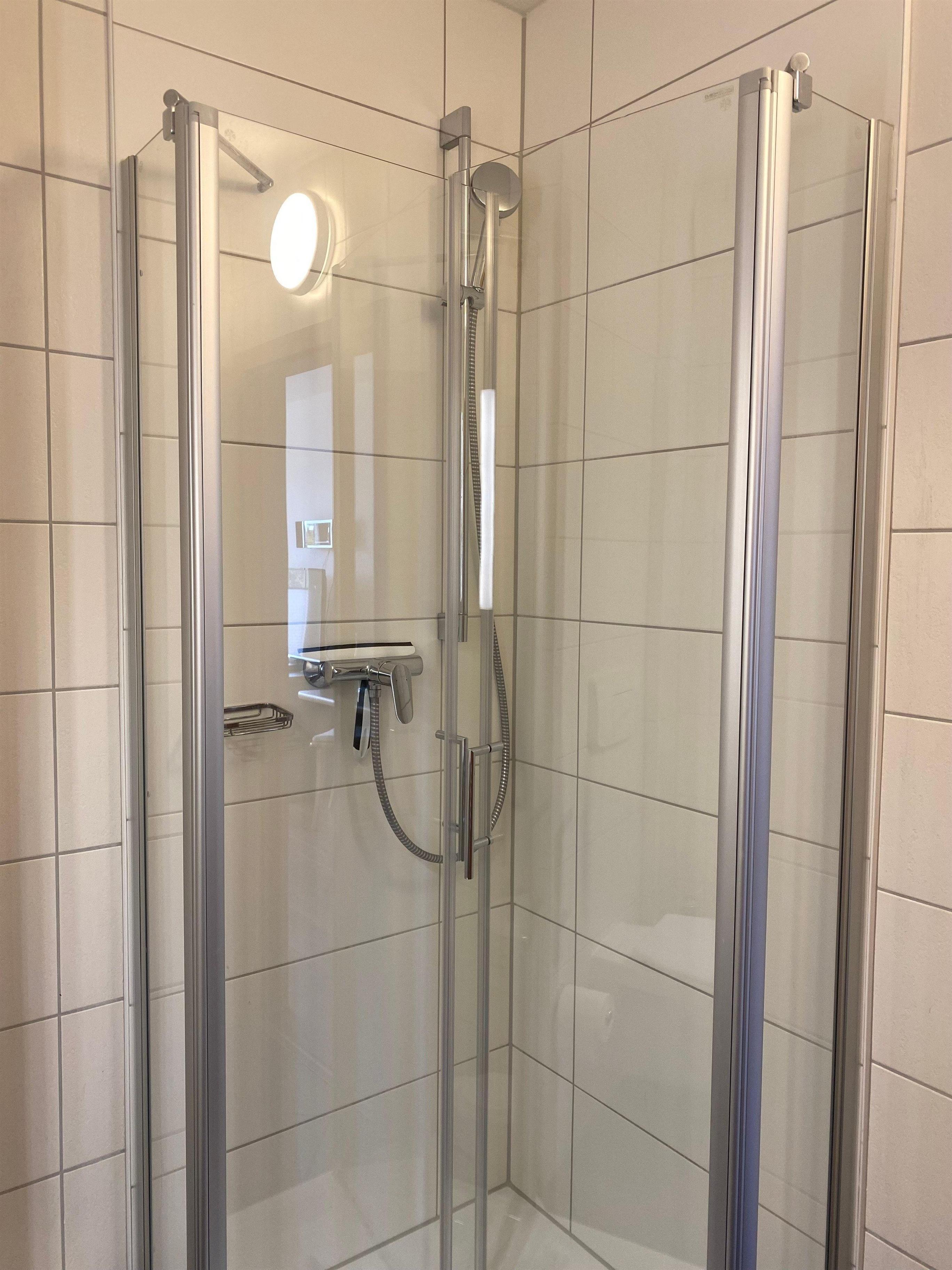 Das Badezimmer ist mit einer Dusche, einem Waschbecken und einem WC ausgestattet.