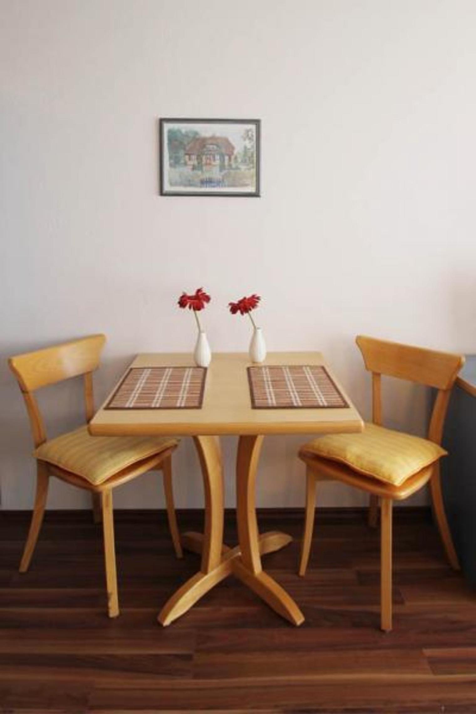 Im Anschluss an den Wohn-/Schlafbereich befindet sich der Essbereich, ausgestattet mit einem kleinen Tisch mit 2 Stühlen sowie einer kleinen Küchenzeile, die voll ausgestattet ist. Schnell können Sie hier Ihre Lieblingsmahlzeit zaubern.