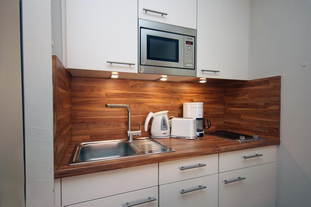 An den Wohnbereich grenzt die kleine Küchenzeile, welche voll ausgestattet ist. Hier finden Sie einen Kühlschrank, einen 2-Platten-Herd, Toaster, Kaffeemaschine, Wasserkocher, Mikrowelle, Geschirrspüler und natürlich genügend Geschirr.
