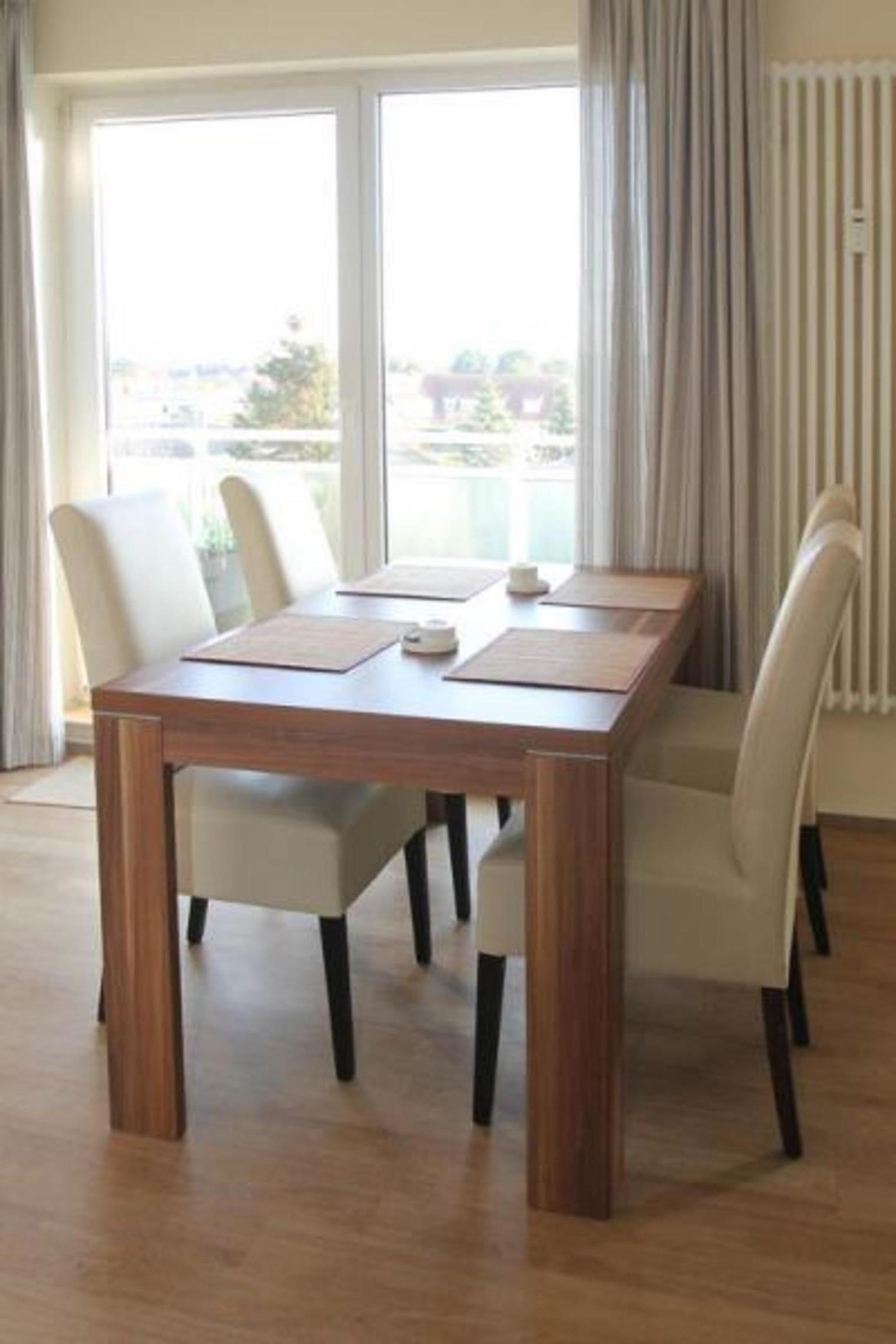 Zu dem lädt ein Esstisch mit Stühlen zum gemütlichen Essen ein.