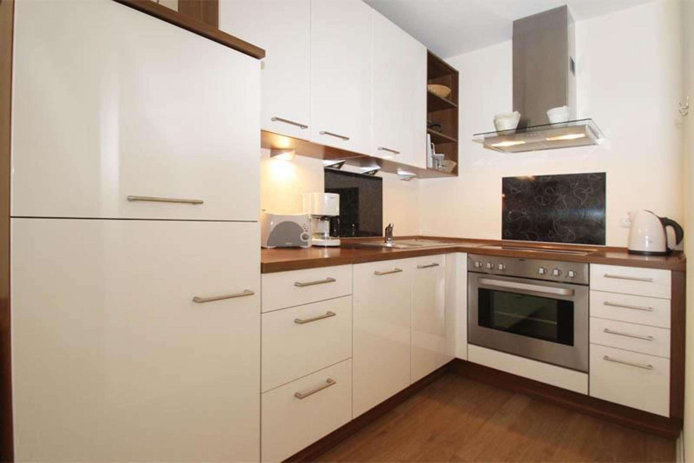 An den Wohnbereich grenzt die kleine Küchenzeile, die voll ausgestattet ist. Hier finden Sie einen 4-Platten-Ceran-Kochherd, Geschirrspülmaschine, Mikrowelle, Toaster, Kaffeemaschine, Wasserkocher und natürlich genügend Geschirr. Hier müssen Sie auf nichts verzichten.