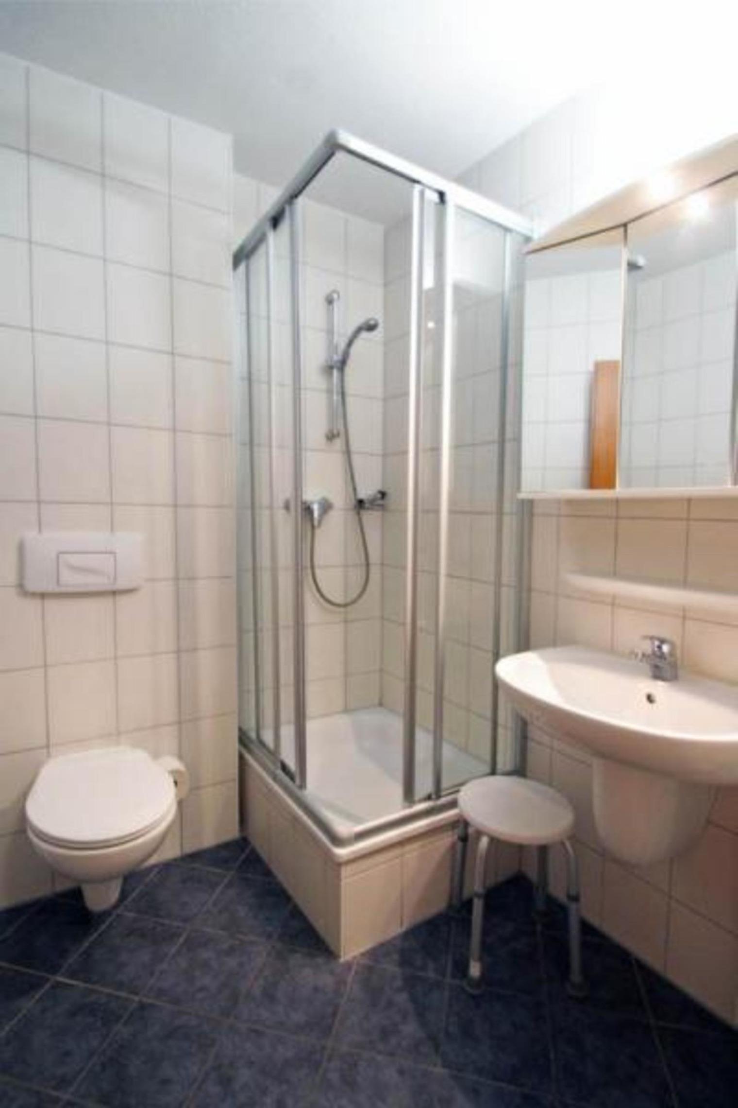 Das Badezimmer ist mit einer Dusche, Waschbecken und WC ausgestattet.