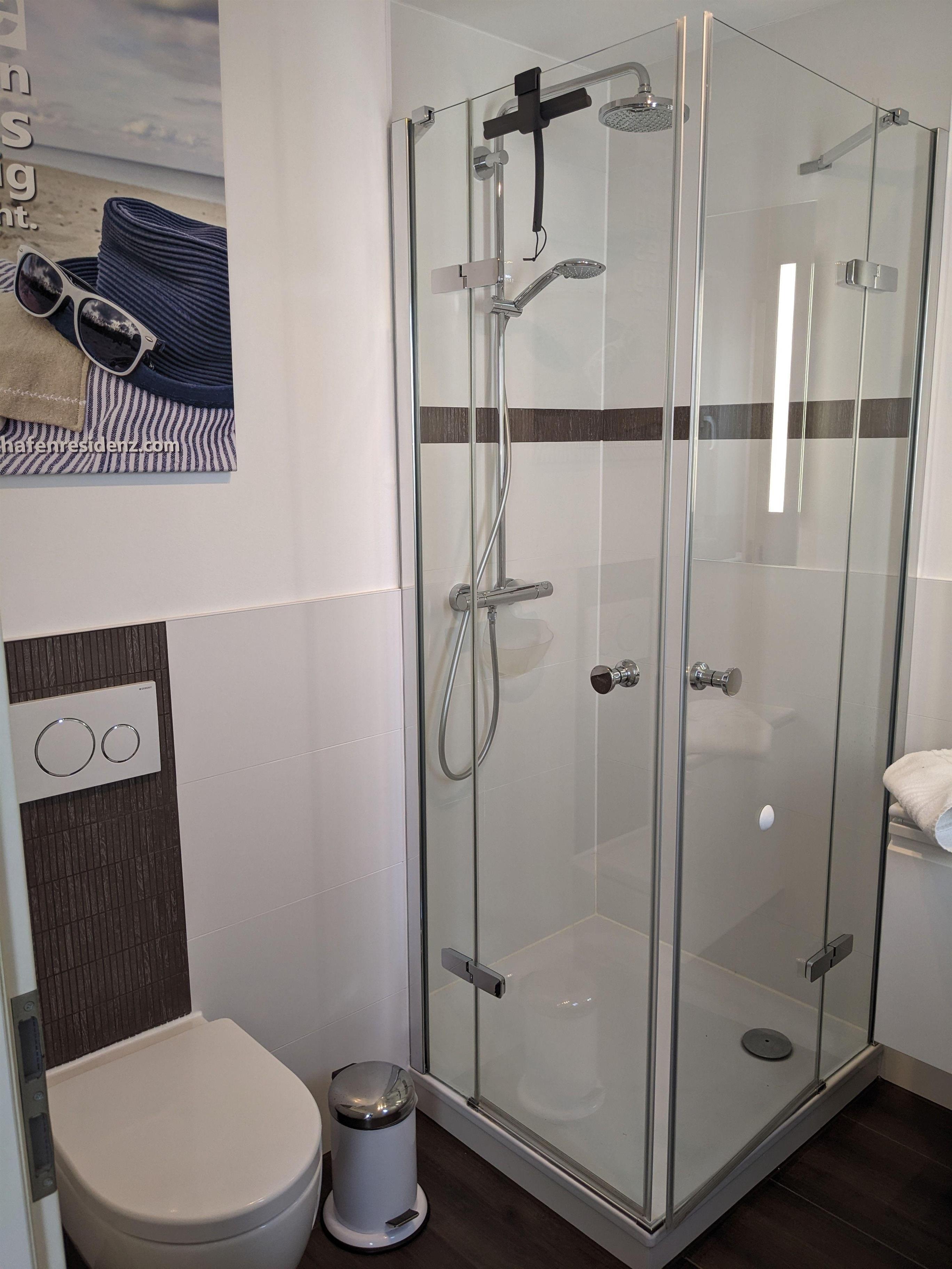 Das neue Badezimmer ist mit einer Dusche, Waschtisch und WC ausgestattet.