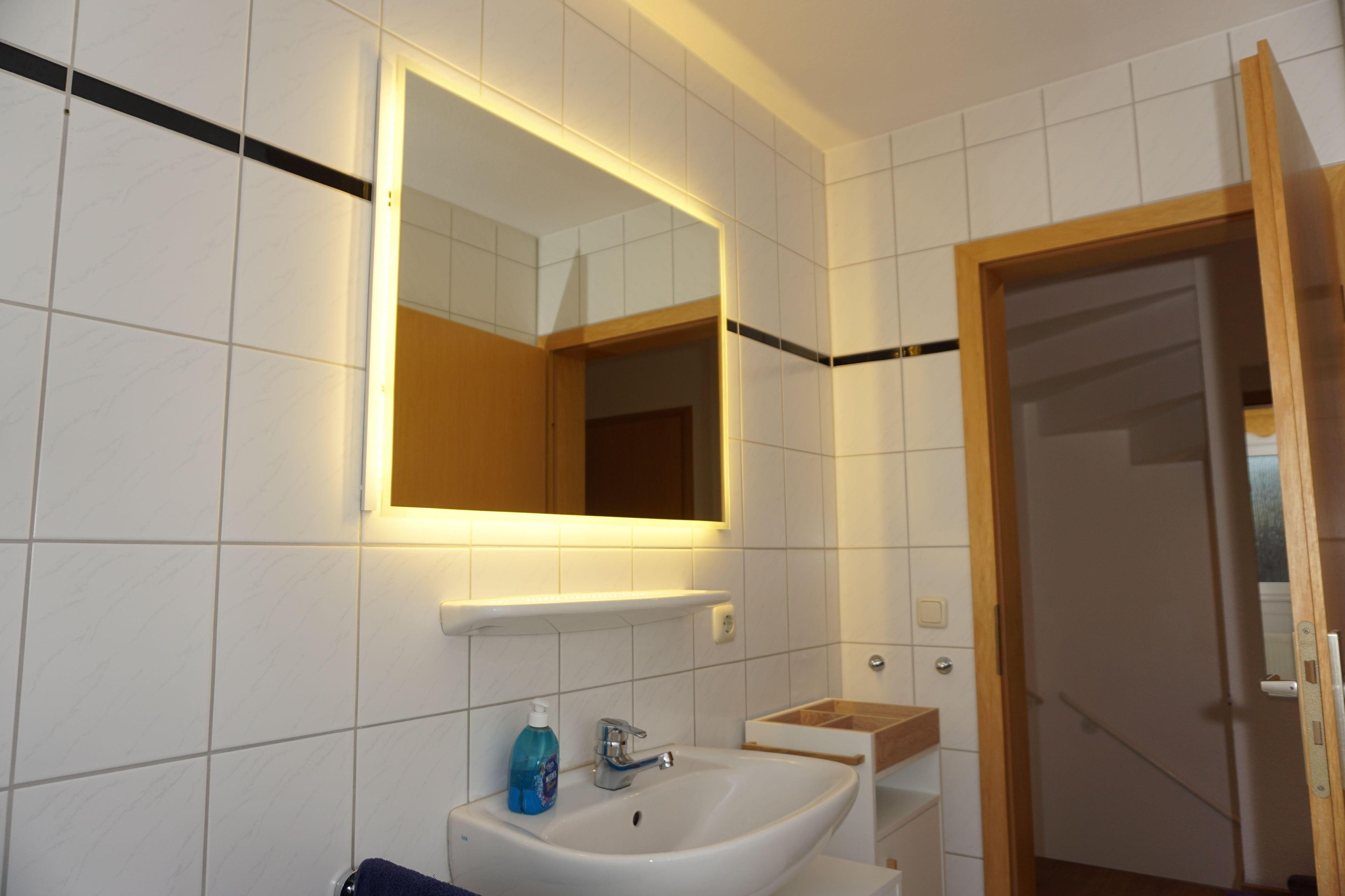 Das Bad verfügt über eine Dusche, ein Aufsatzwaschbecken mit Unterschrank, ein WC sowie einen großen Lichtspiegel.