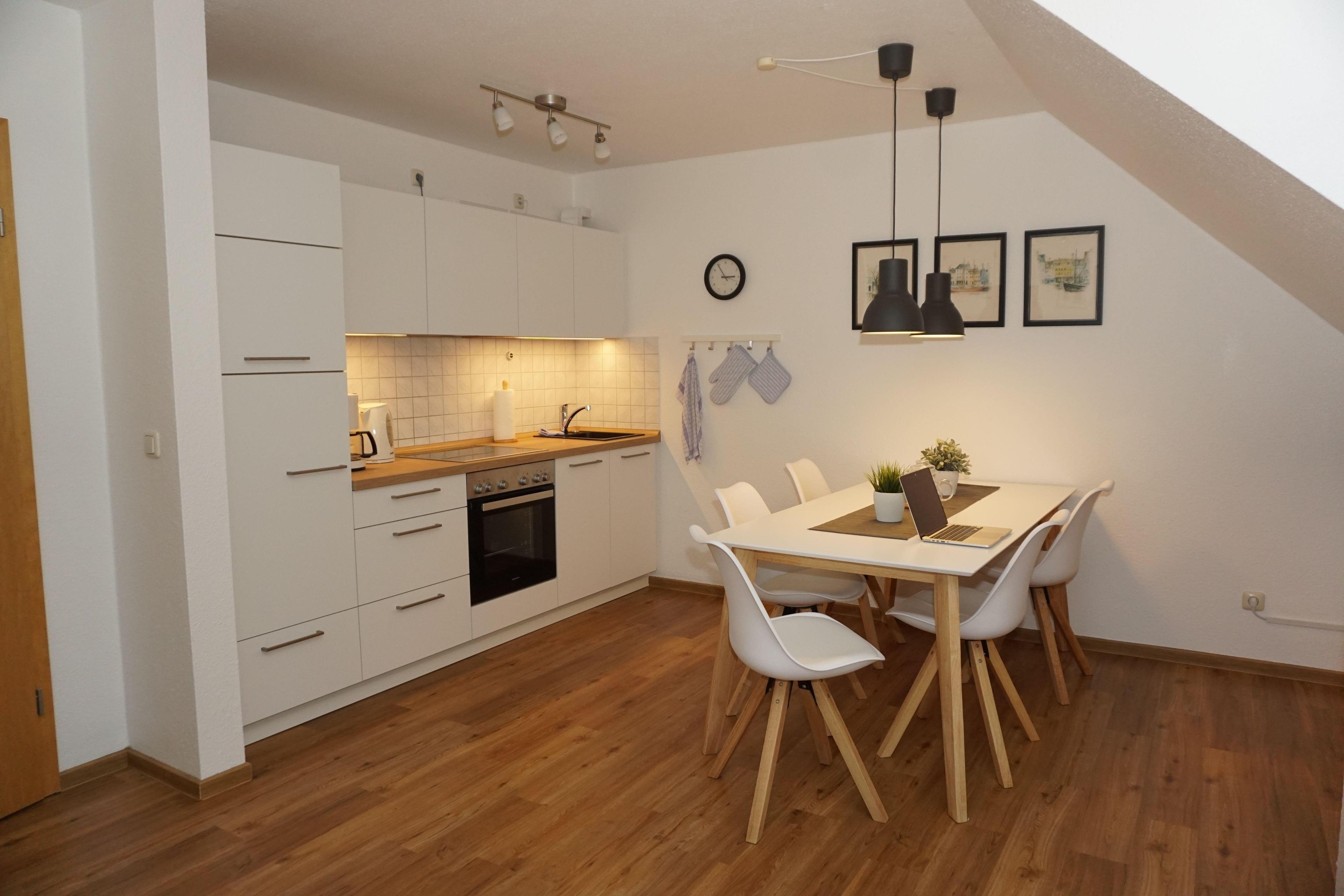 Der Wohnbereich mit angrenzender Küche ist hell und modern eingerichtet. Der Holzdesignboden verleiht dem Raum eine angenehme Atmosphäre. Zum gemütlichen Familienfrühstück stehen Ihnen ein Wasserkocher, Toaster, Kaffeemaschine und ausreichend Geschirr zur Verfügung.