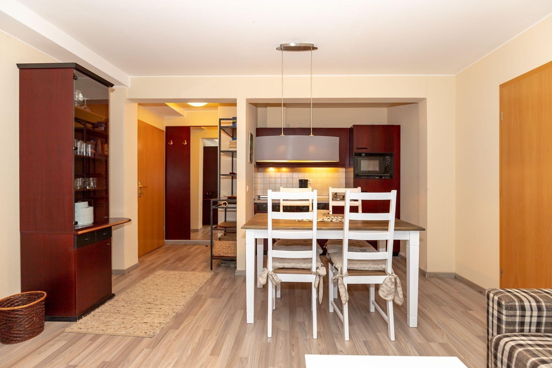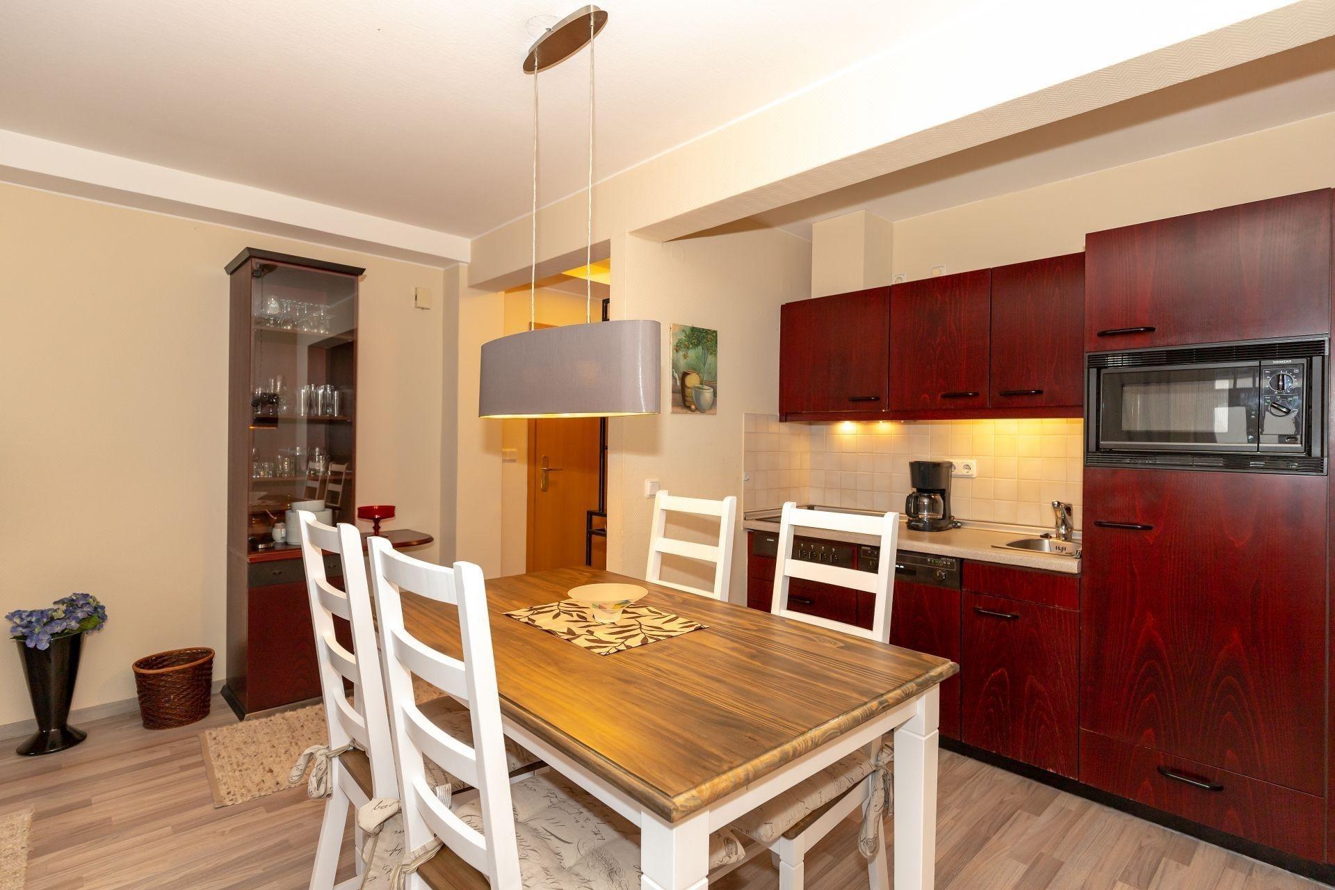Der integrierte Küchenbereich mit einem großen Esstisch für 4 Personen und einer voll ausgestatteten Küchenzeile bietet Ihnen alle Bequemlichkeiten, die in einer modernen Küche nicht fehlen dürfen.