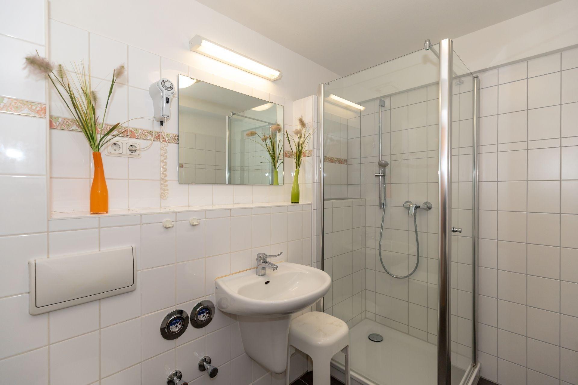 In der Wohnung befindet sich ein großes und geschmackvoll gefliestes Badezimmer mit einer ebenerdigen Dusche, einem WC, einem Handtuchheizkörper, einem Waschbecken und einem Föhn.
