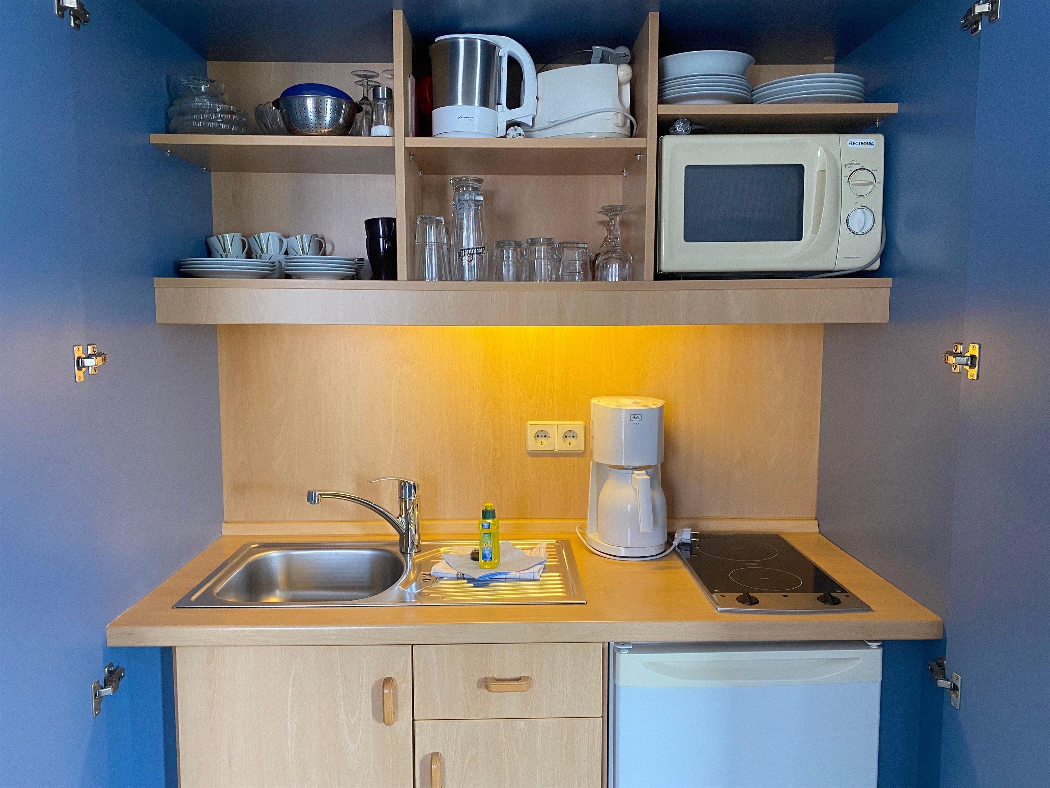 An den Wohnbereich grenzt sowohl der Esstisch für die gemeinsamen Mahlzeiten als auch die kleine Küchenzeile, die mit einem 2-Platten-Herd, einem Toaster, einer Kaffeemaschine und einem Wasserkocher ausgestattet ist. Natürlich ist auch ausreichend Geschirr vorhanden.