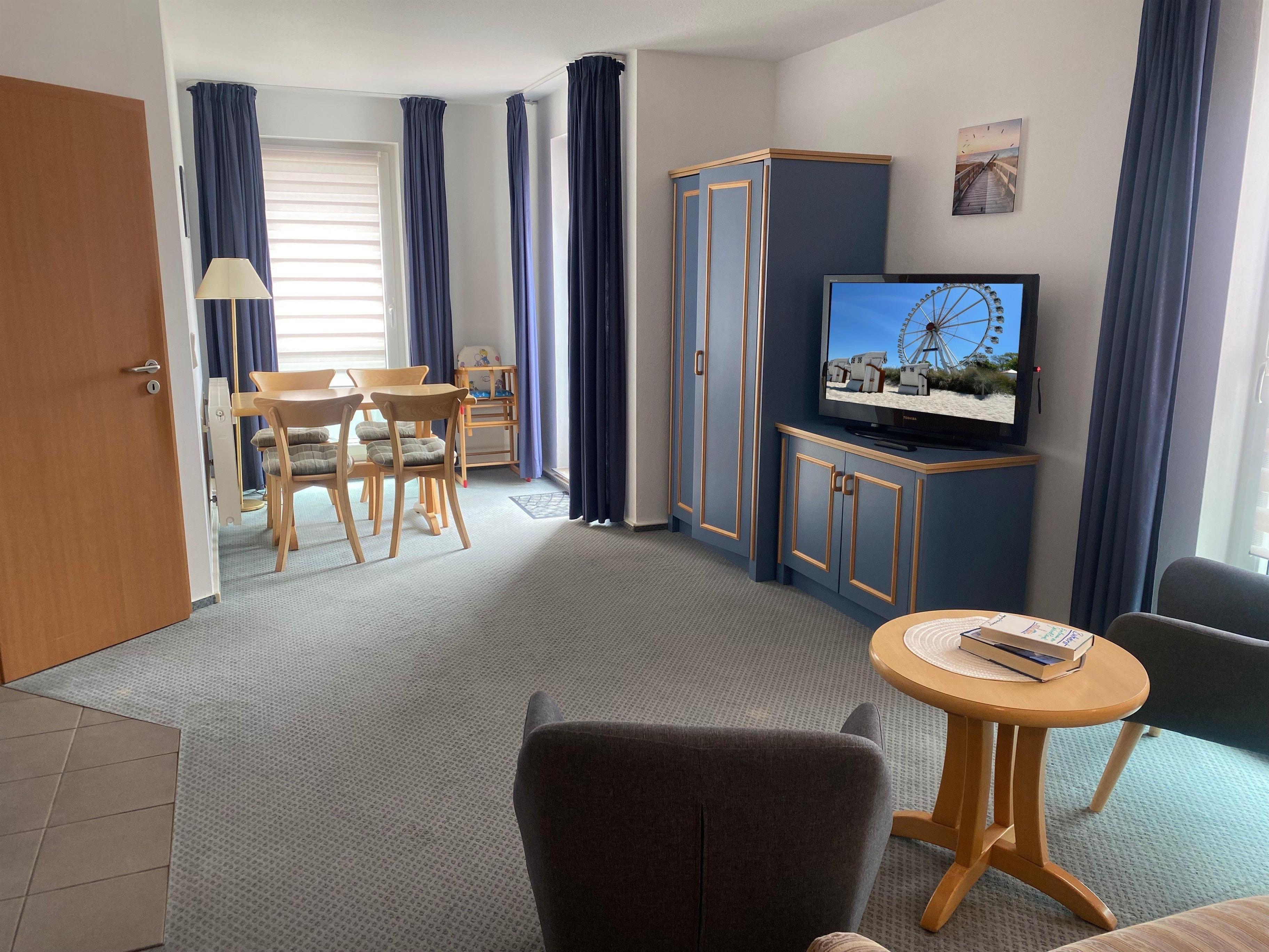 Der Wohnbereich ist mit einer kuscheligen Sofa- und Sesselecke eingerichtet. Hier können Sie nach einem ereignisreichen Urlaubstag entspannen und das Fernsehprogramm genießen. Hierfür steht Ihnen ein Flachbildschirm-TV zur Verfügung.