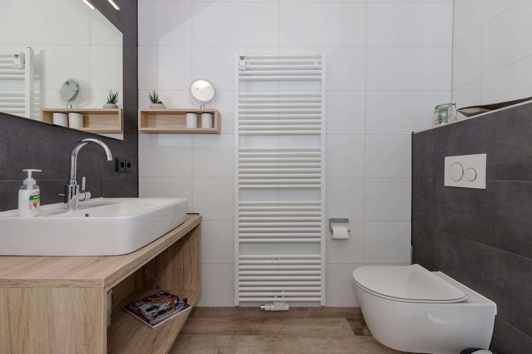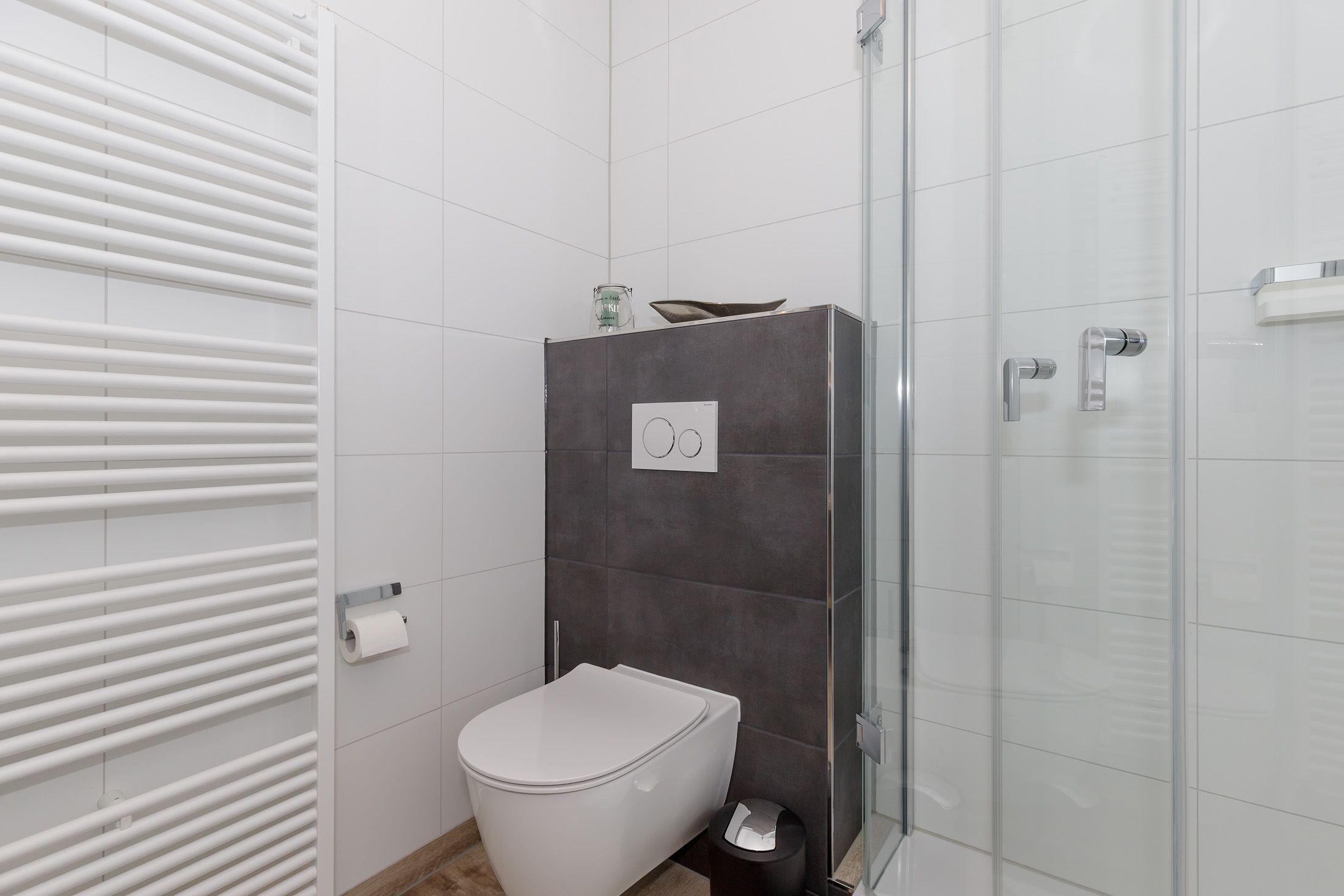 Das innenliegende Badezimmer wurde 2021 aufwendigt mit einer Dusche mit flachen Einstieg saniert und verfügt über einen Föhn.