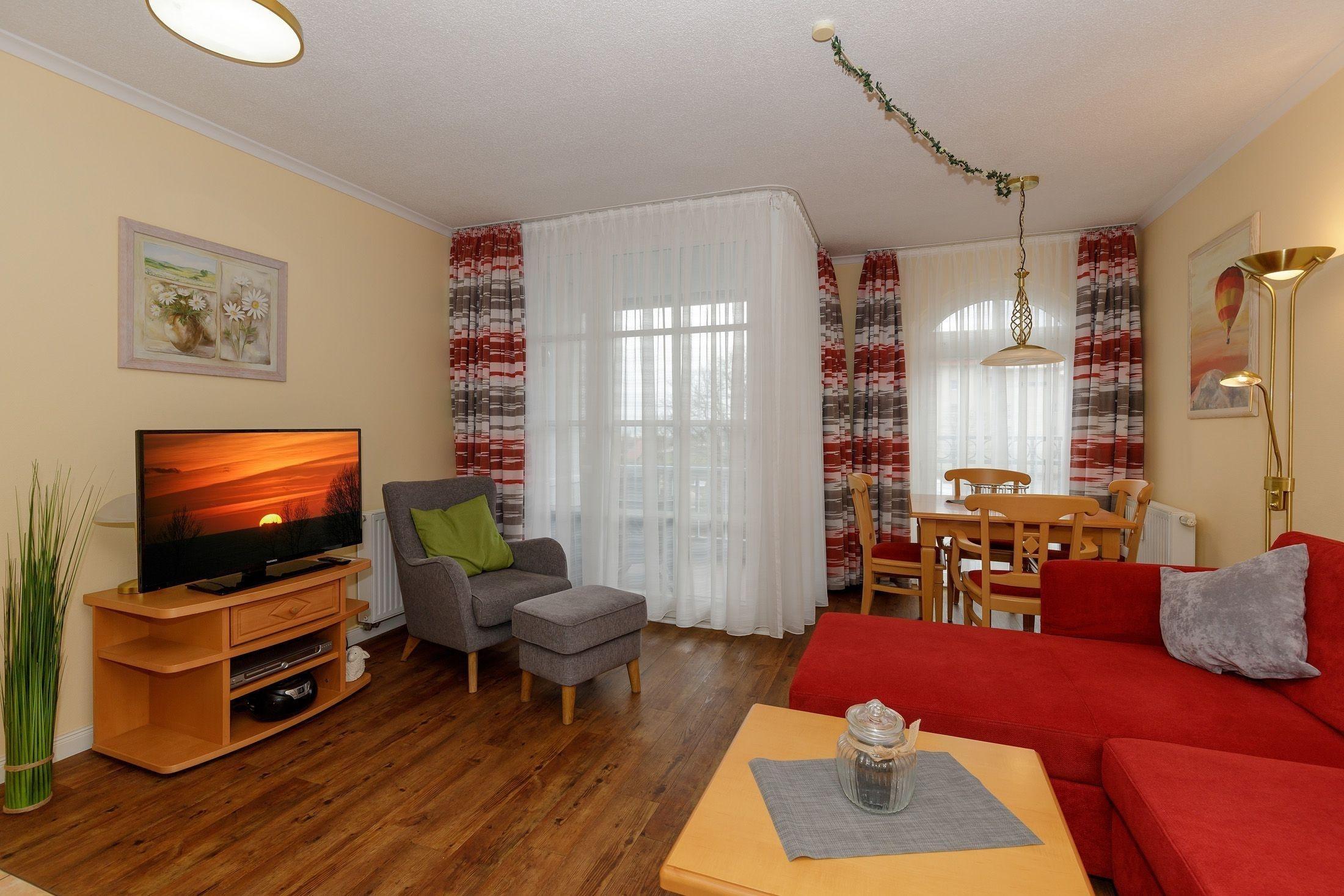 Der Wohnbereich ist mit einer großzügigen Eck-Couch ausgestattet, die sich problemlos zu einem Schlafplatz für die 3te und 4te Person verwandeln lässt. Ein Flachbildfernseher mit HiFi- Anlage und ein DVD-Player stehen für Sie bereit. Der gemütliche Ohrensessel mit Hocker lädt zum Entspannen oder zum Lesen ein.