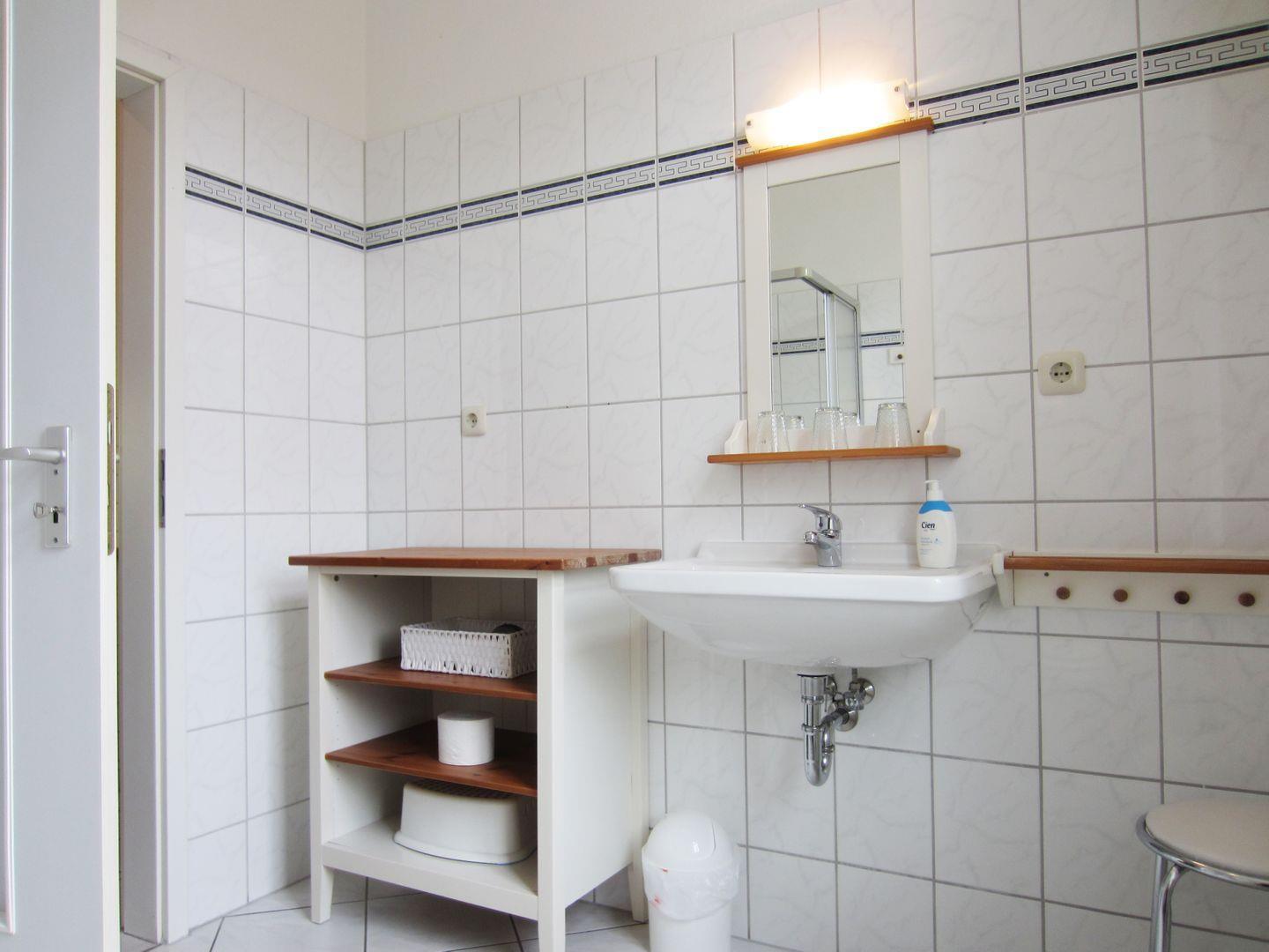 Das Badezimmer verfügt über eine praktische Dusche, Waschbecken, Spiegel, WC sowie ein Fenster. Hier sorgt eine Heizung für Wohlbefinden auch an kühleren Tagen, ebenso wie im Rest der Unterkunft.