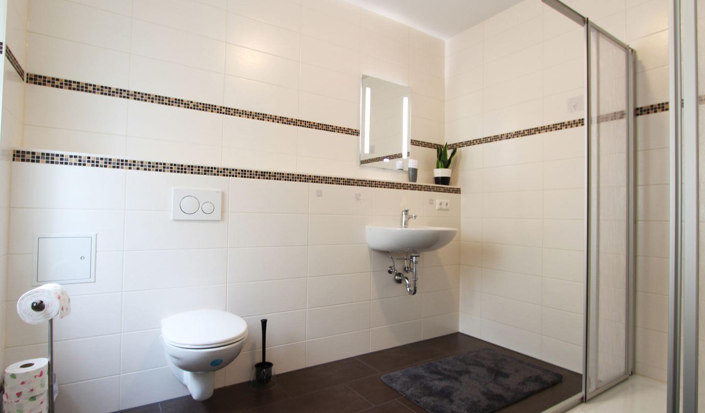 Das Badezimmer verfügt über eine bodengleiche Dusche, ein Waschbecken, einen Spiegel und Toilette sowie warmes Wasser. Die moderne und pflegeleichte Ausstattung macht es einfach, sich auch im Urlaub wohlzufühlen. Ein Wäscheständer, Staubsauger und Garderobe ergänzen das Angebot für einen komfortablen Aufenthalt.