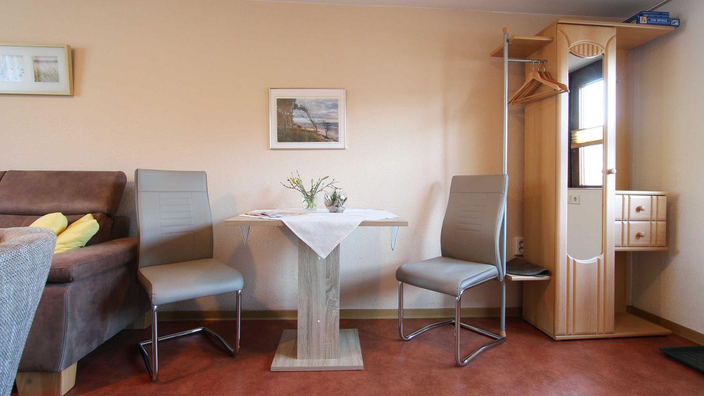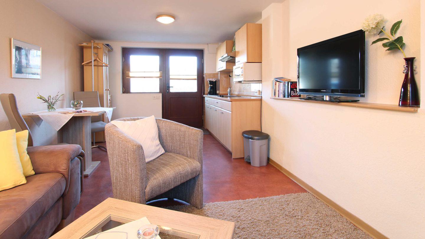 Eine gemütliche und ruhiggelegene 2-Raumwohnung, 32 m², im Anbau eines Einfamilienhauses. Wohnzimmer mit TV und Sitzecke, offene Küche mit Kühlschrank, 2er Ceranfeld, Mikrowelle, Wasserkocher und Kaffeemaschine, Essecke, Garderobe, Schlafzimmer mit Doppelbett und großen Kleiderschrank, angrenzendes Bad mit WC, Dusche und kleinem Tageslichtfenster. Parkplatz befindet sich direkt vor dem Haus.