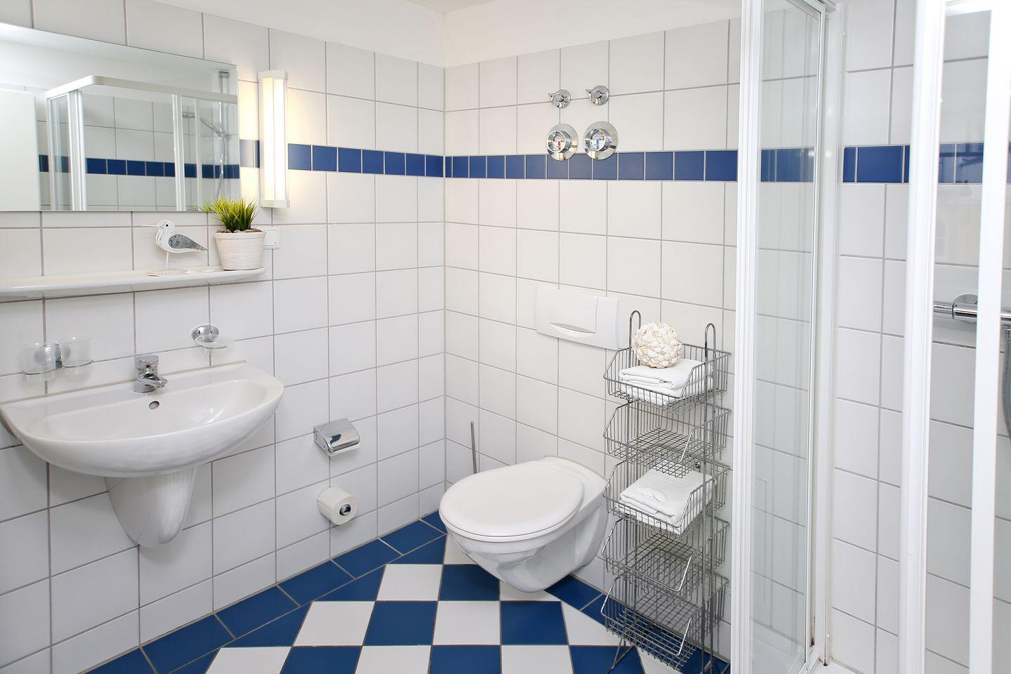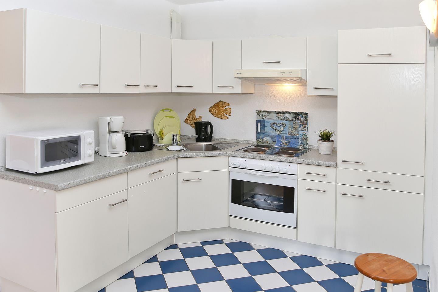 Von der Garderobe im Flur gelangt man in das erste Schlafzimmer mit extrabreitem Boxspringbett sowie den großzügigen Essbereich mit modern ausgerüsteter offener Küche. Von dort geht es zwei Stufen nach unten in einen gemütlichen Wohnbereich bis hin zum Balkon. Das zweite Schlafzimmer hat ein stabiles Hochbett und ebenso Zugang zum geräumigen Westbalkon, der zum Sonnenbaden einlädt. Medientechnisch ist die Einrichtung auf dem neuesten Stand mit WLAN, Smart-TV, Blue-Ray-Player und DAB+ Radio mit Bluetooth.