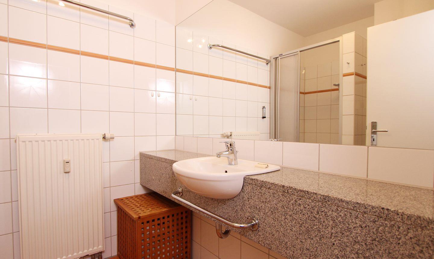 Das Badezimmer verfügt über eine Dusche, Waschbecken, Kosmetikspiegel und Haartrockner sowie WC. Ein Rauchmelder sorgt zusätzlich für Sicherheit.