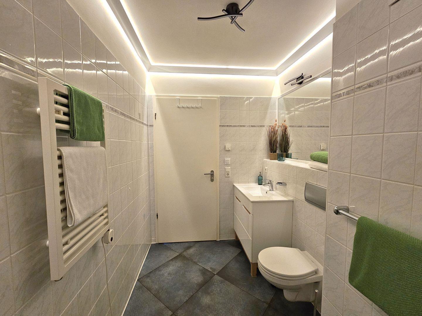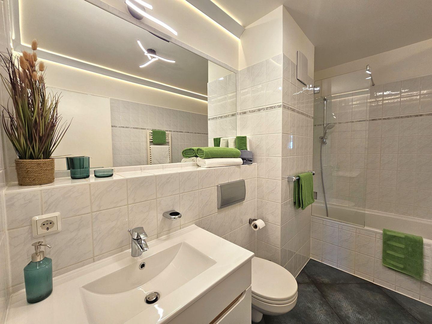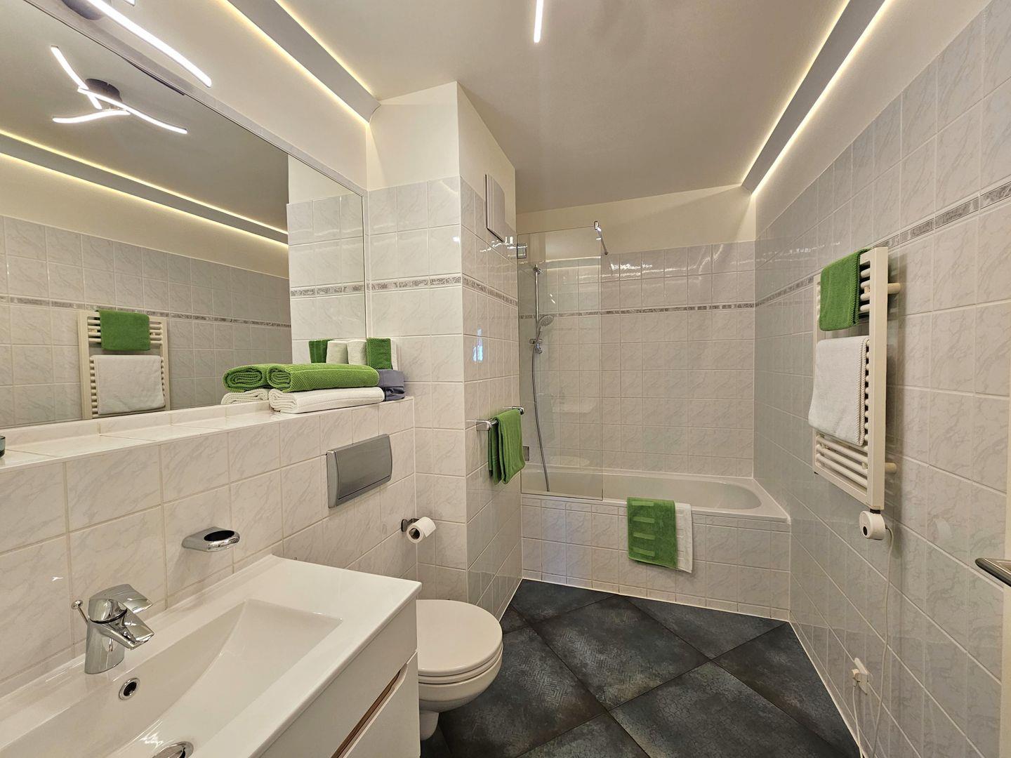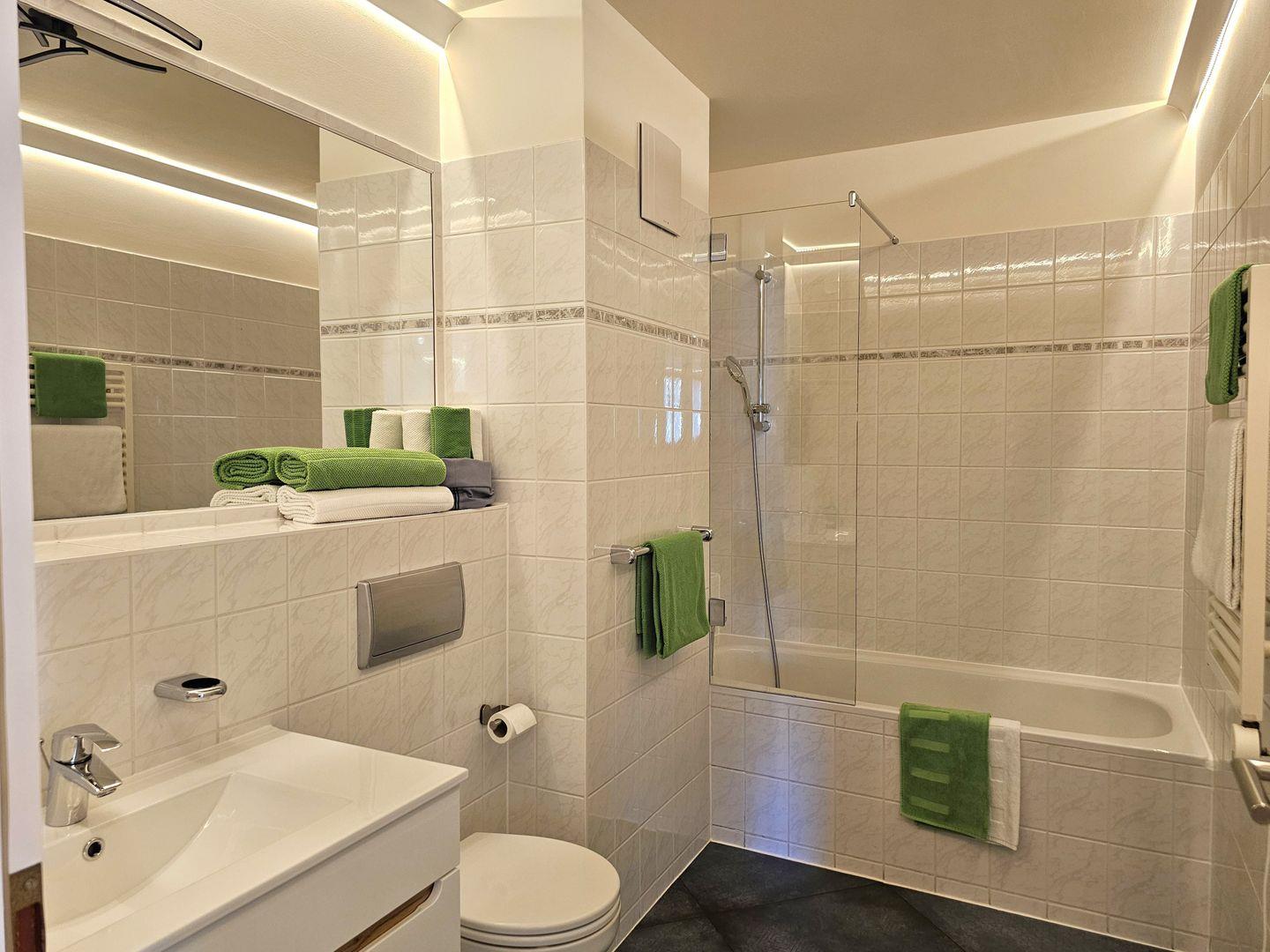 Das Badezimmer ist eine kleine Wellness-Oase: Mit Badewanne, Duschtrennwand, Waschbecken, WC, Handtuch-Heizkörper und Fußbodenheizung lädt es zum Entspannen nach einem erlebnisreichen Tag ein.