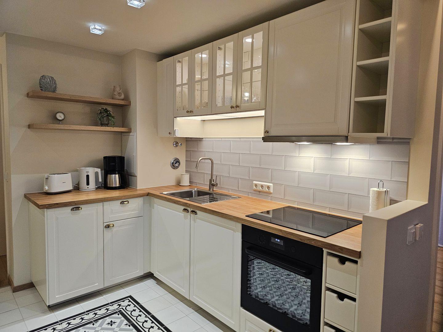 Die offene Küche ist voll ausgestattet mit allem, was Sie für romantische Dinner oder gemütliche Kochabende brauchen: ein Ceran-Kochfeld, Backofen, Kühlschrank mit Gefrierfach, Geschirrspüler, Kaffeemaschine, Wasserkocher und Toaster. Hier können Sie kulinarische Köstlichkeiten zaubern und gemeinsam genießen.