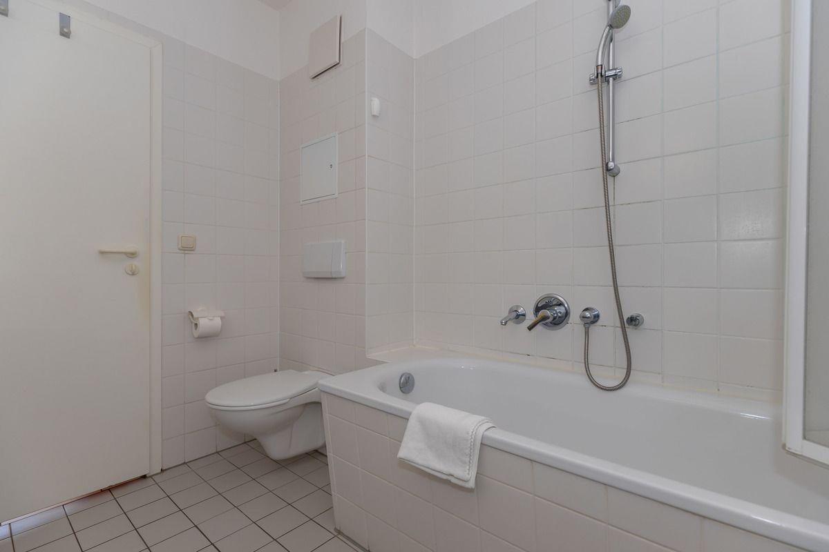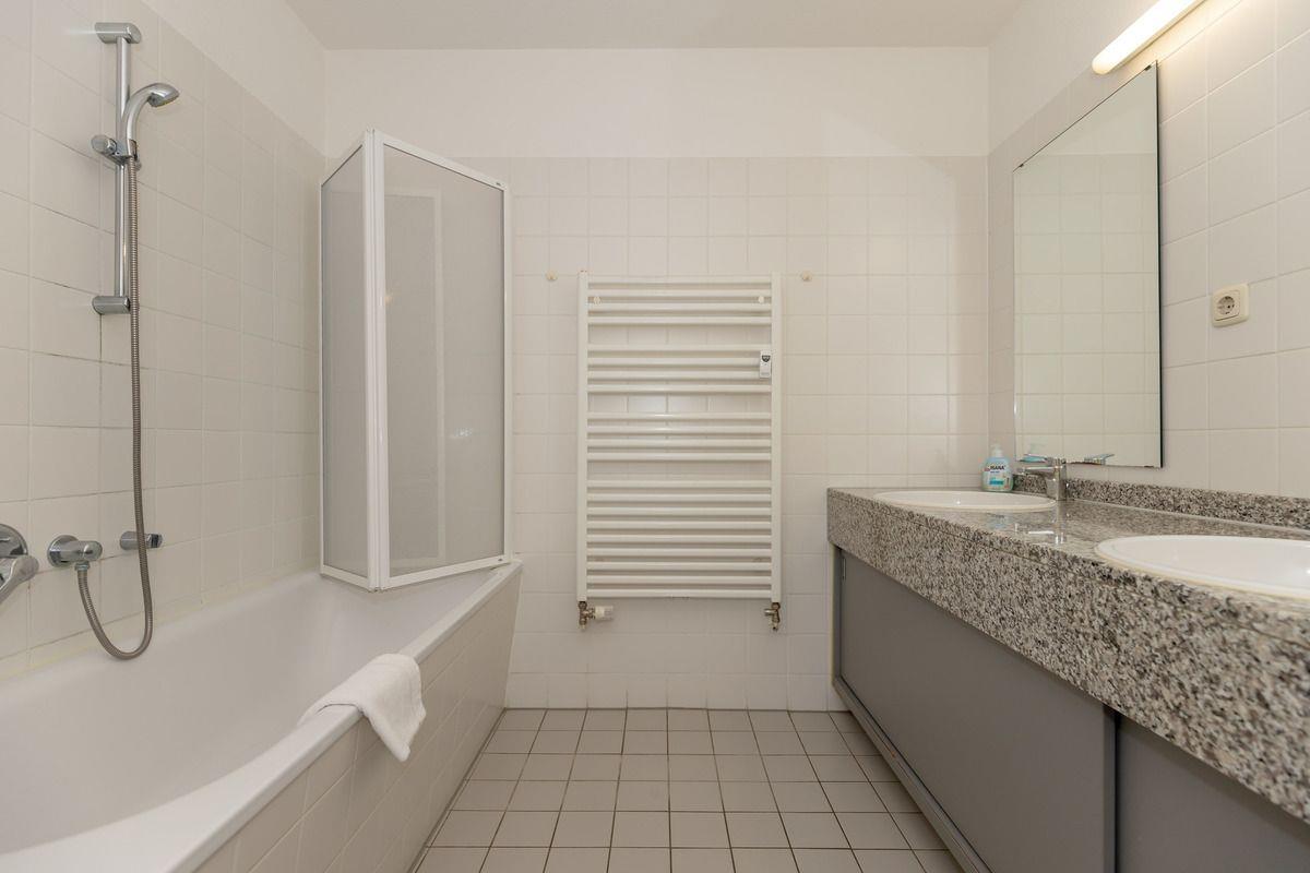 Das geräumige Badezimmer verfügt über eine Badewanne, einen großen Waschtisch mit 2 Waschbecken und Unterschrank, WC, Föhn, Hocker, Handtuch-Heizkörper sowie ausreichend Ablagemöglichkeiten.